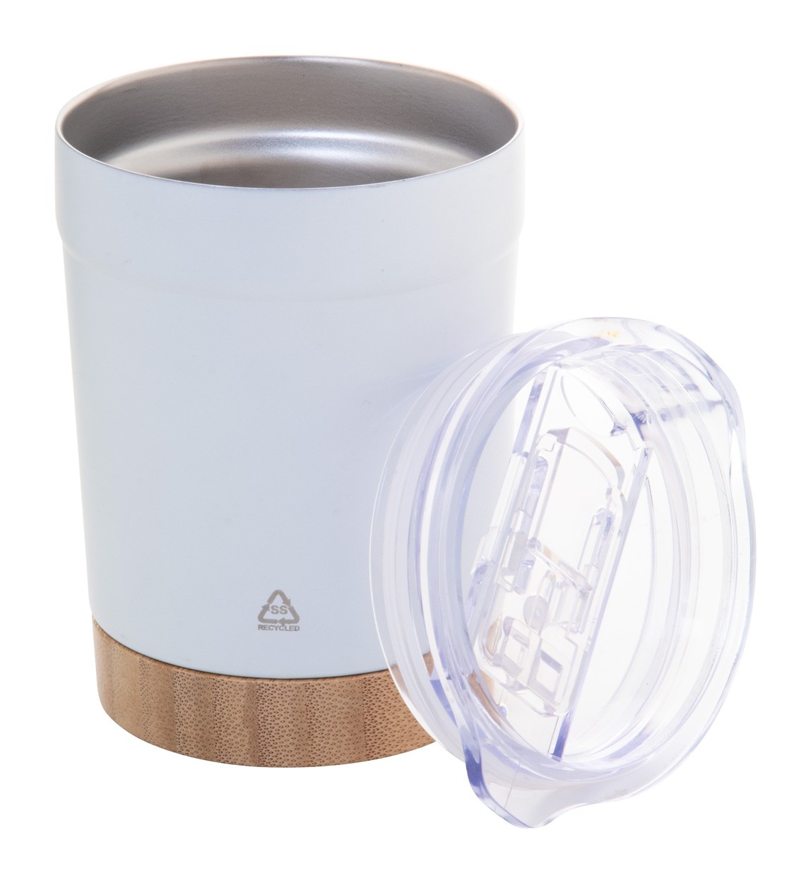 Cană termoizolată, din oțel inoxidabil reciclat, cu perete dublu, cu bază din bambus și capac pentru băut din plastic AS. 300 ml.