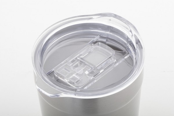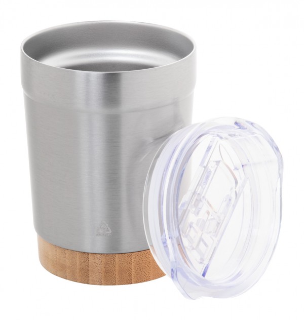 Cană termoizolată, din oțel inoxidabil reciclat, cu perete dublu, cu bază din bambus și capac pentru băut din plastic AS. 300 ml.