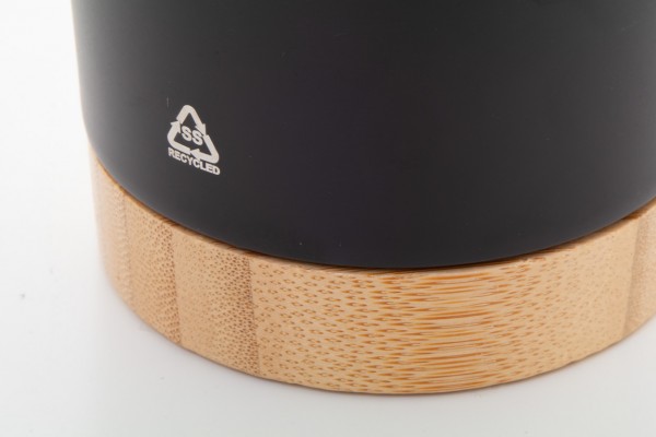 Cană termoizolată, din oțel inoxidabil reciclat, cu perete dublu, cu bază din bambus și capac pentru băut din plastic AS. 300 ml.