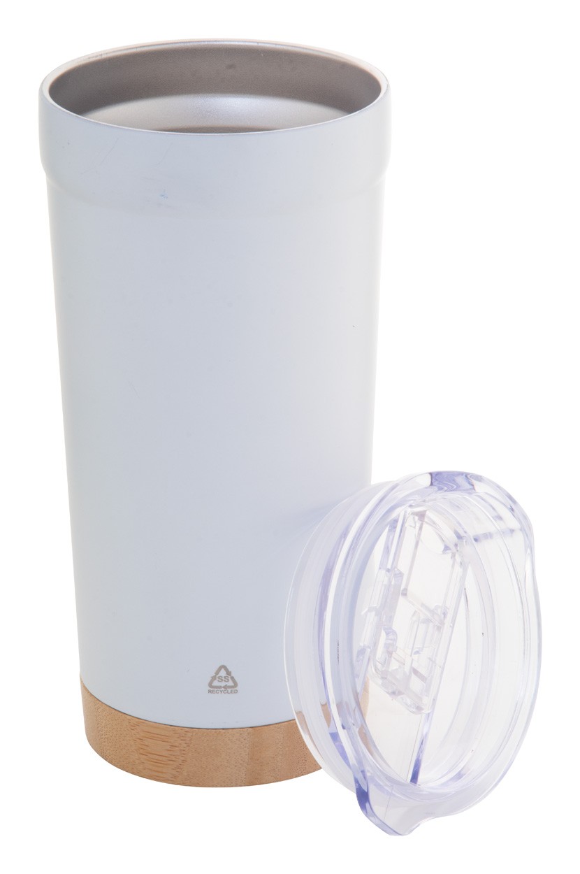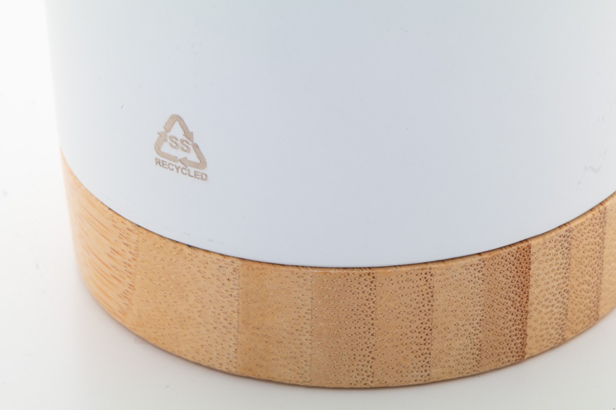 Cană termoizolată, din oțel inoxidabil reciclat, cu perete dublu, cu bază din bambus și capac pentru băut din plastic AS. 600 ml.