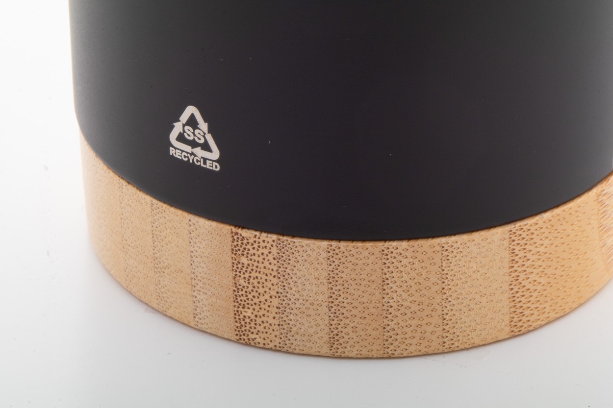 Cană termoizolată, din oțel inoxidabil reciclat, cu perete dublu, cu bază din bambus și capac pentru băut din plastic AS. 600 ml.