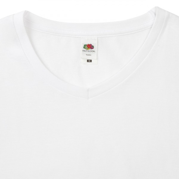Tricou cu decolteu în V pentru adulți, de culoare albă. 100% bumbac pieptănat, ring-spun, 140 g/m². Produs marca Fruit of the Loom.