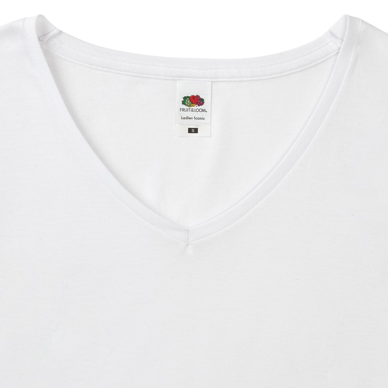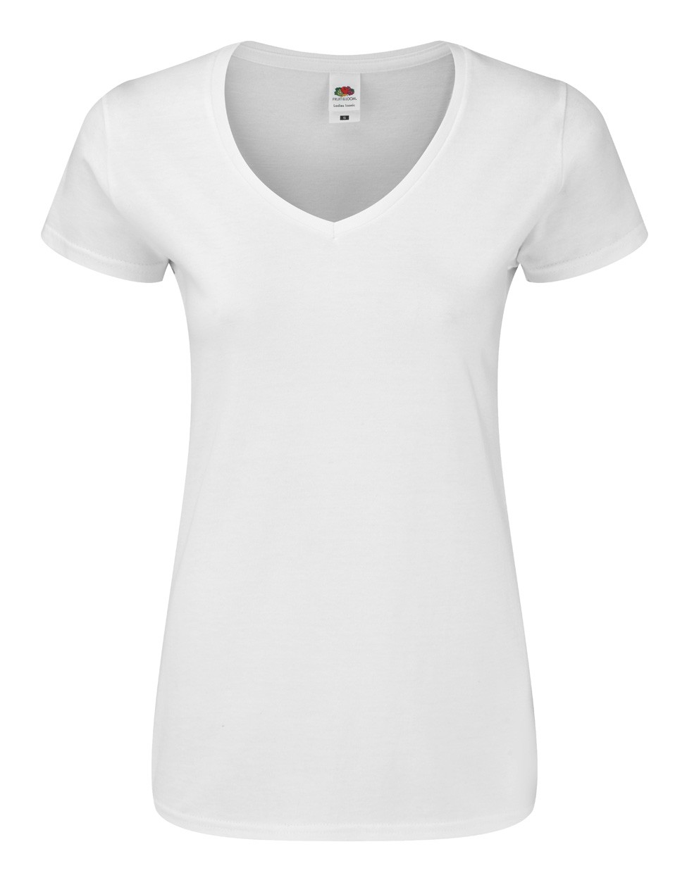 Tricou de damă, cu decolteu în V, de culoare albă. 100% bumbac pieptănat, ring-spun, 140 g/m². Produs marca Fruit of the Loom.