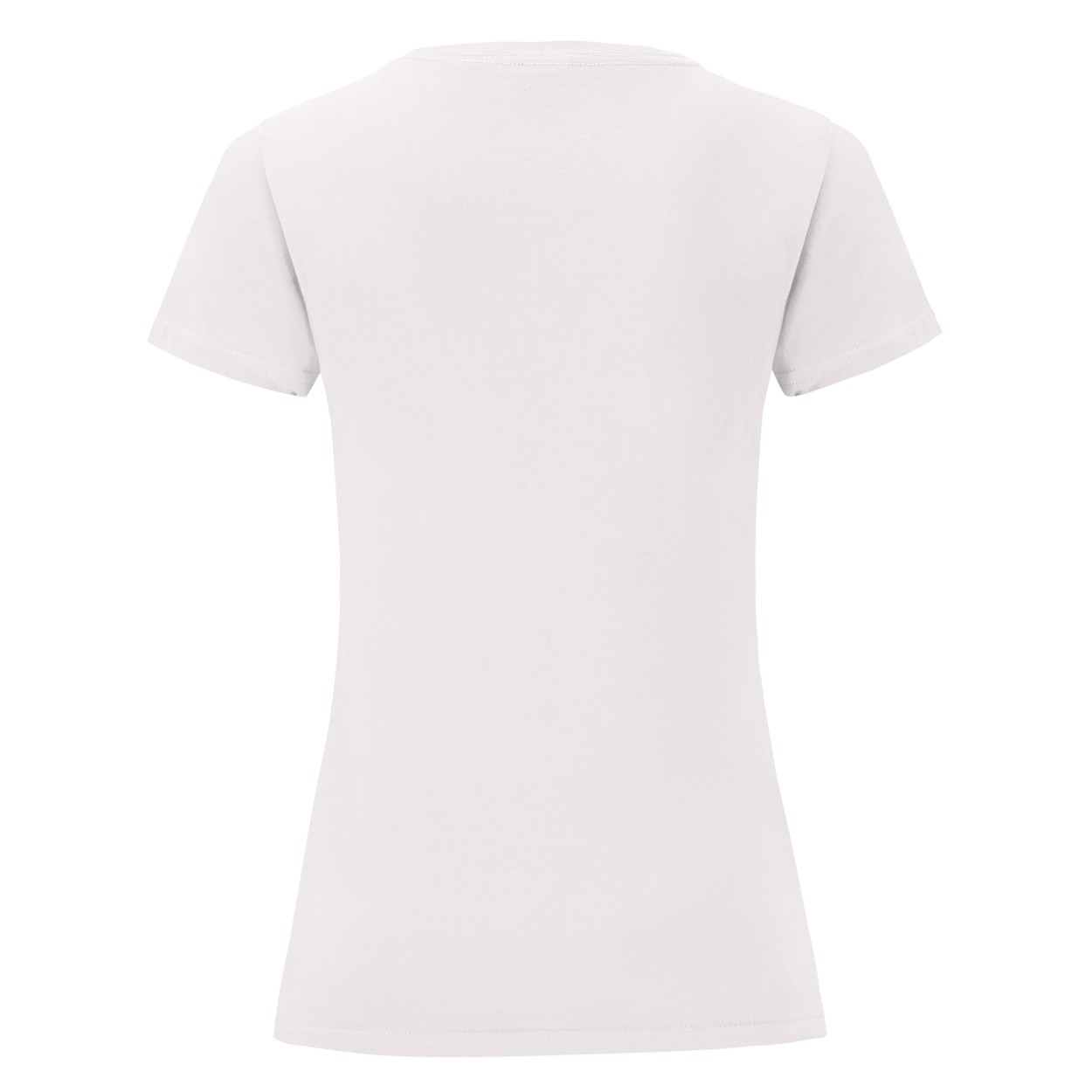 Tricou de damă, cu gât rotund, de culoare albă. 100% bumbac pieptănat, ring-spun, 140 g/m². Produs marca Fruit of the Loom.