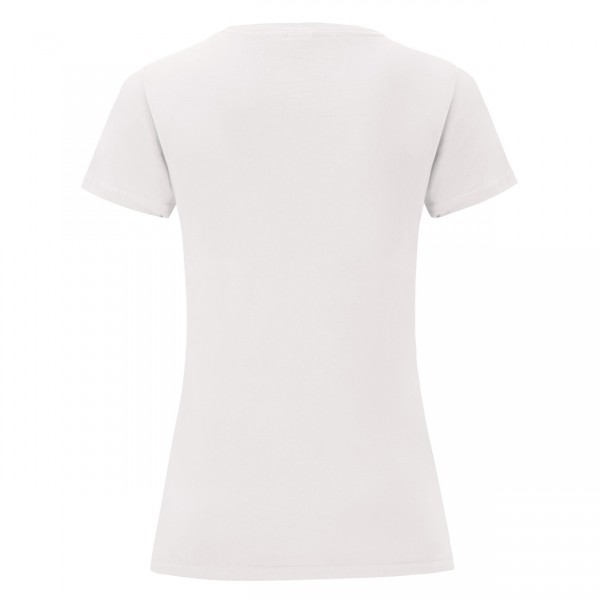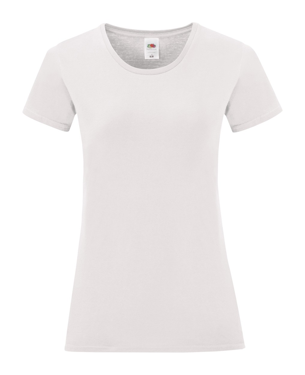 Tricou de damă, cu gât rotund, de culoare albă. 100% bumbac pieptănat, ring-spun, 140 g/m². Produs marca Fruit of the Loom.