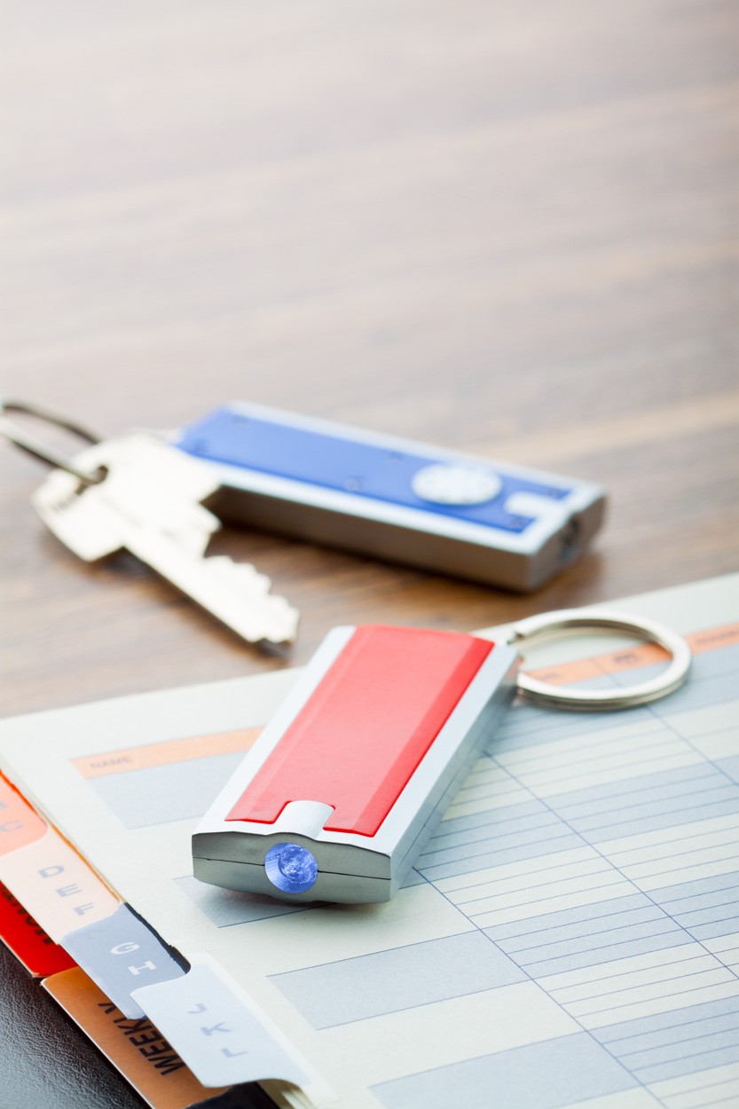 Breloc din plastic, cu led şi inel din metal.Se livrează cu 3 baterii.
