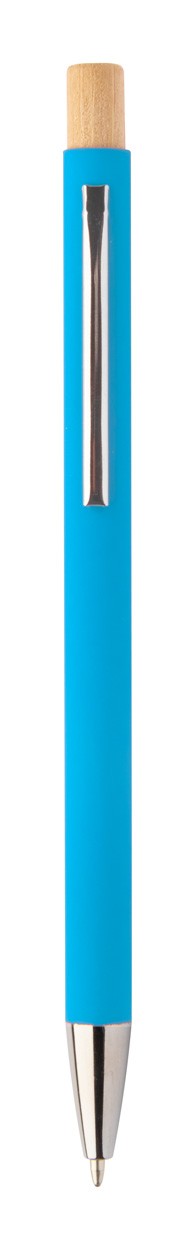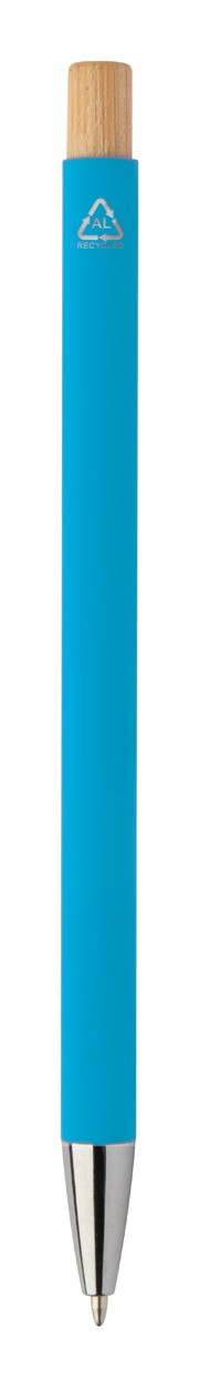 Pix din aluminiu reciclat, cu finisaj cauciucat și buton din bambus și detalii cromate. Cu acoperire specială pentru gravarea laser în oglindă. Cu mină albastră.