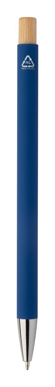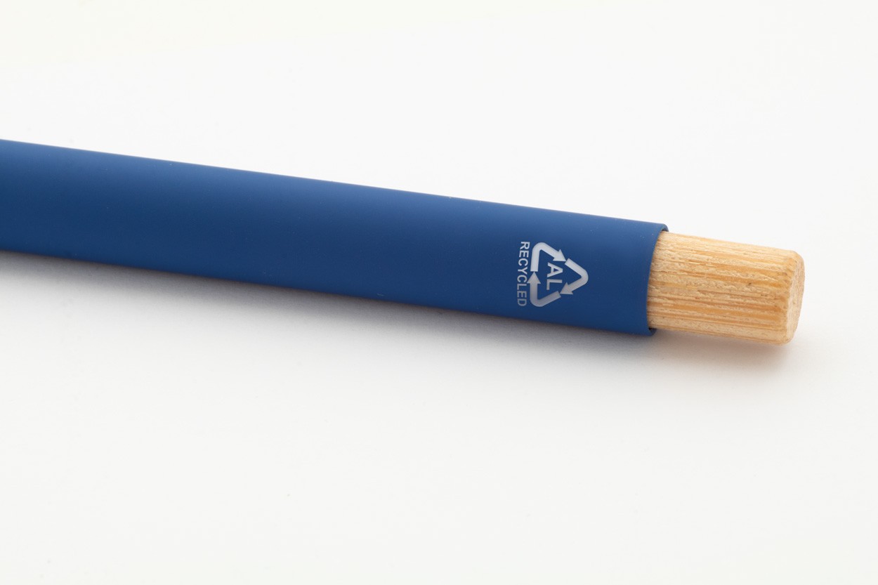 Pix din aluminiu reciclat, cu finisaj cauciucat și buton din bambus și detalii cromate. Cu acoperire specială pentru gravarea laser în oglindă. Cu mină albastră.