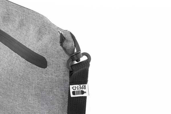 Geantă pentru cosmetice, rezistentă la apă, cu fermoar, din poliester RPET 300D, cu curea de mână cu carabină. Cu etichetă distinctivă RPET.