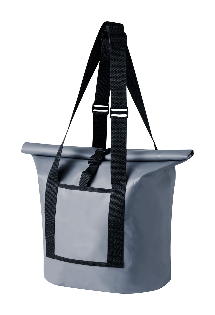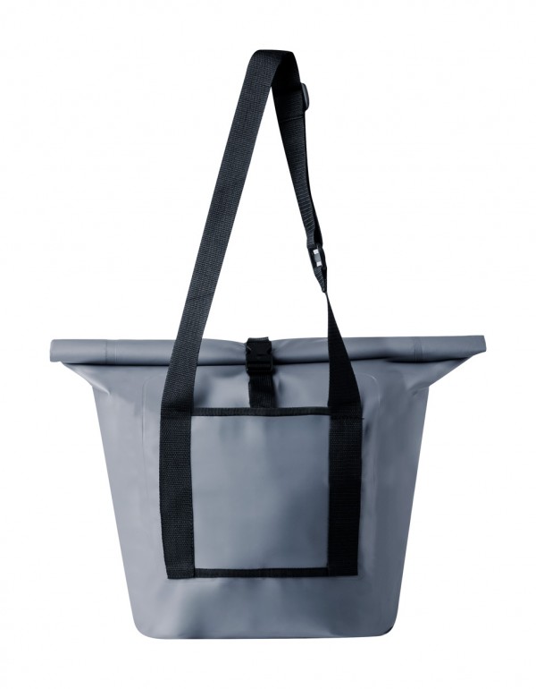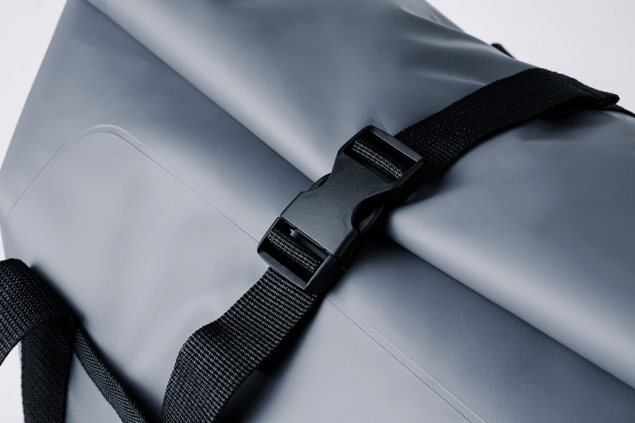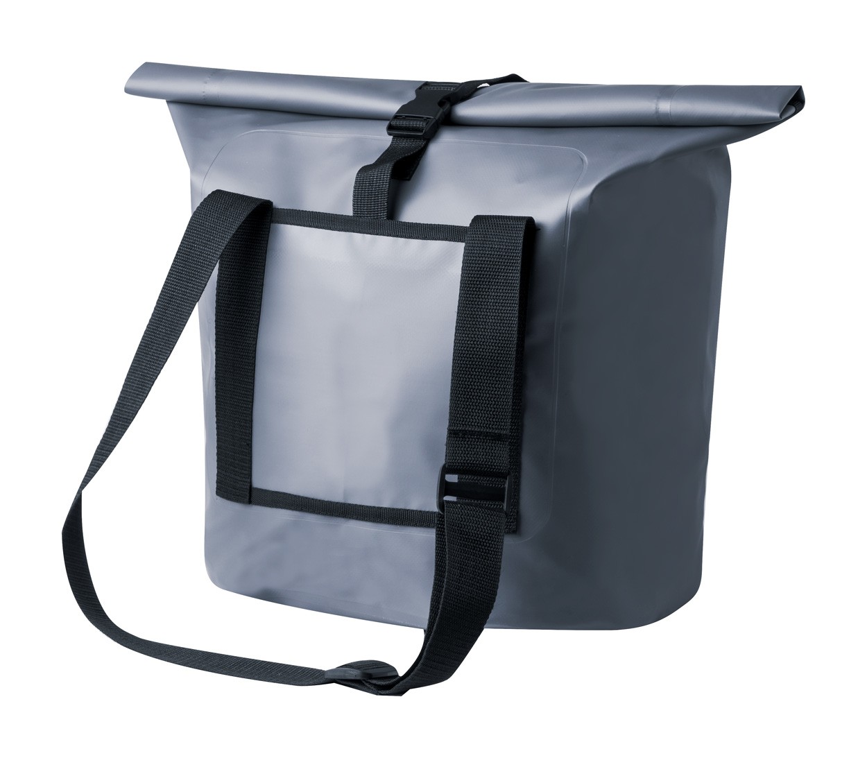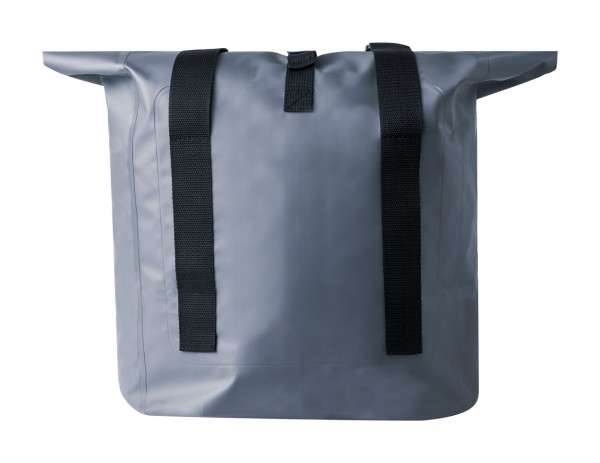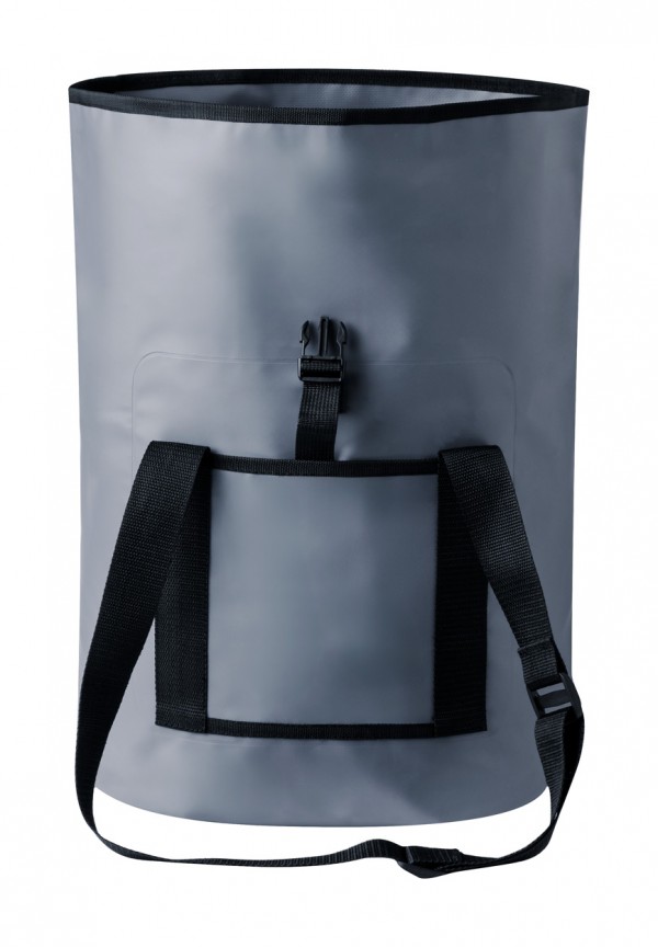 Geantă impermeabilă din PVC, cu compartiment principal, închidere cu cataramă și mânere reglabile.