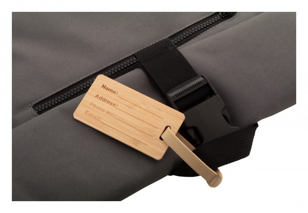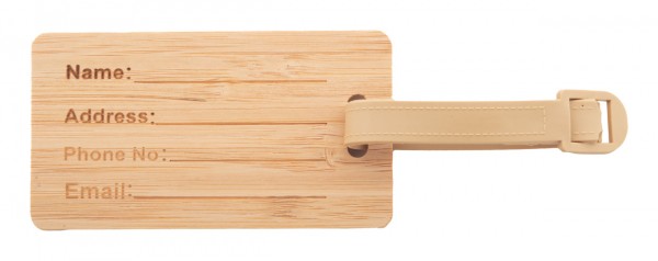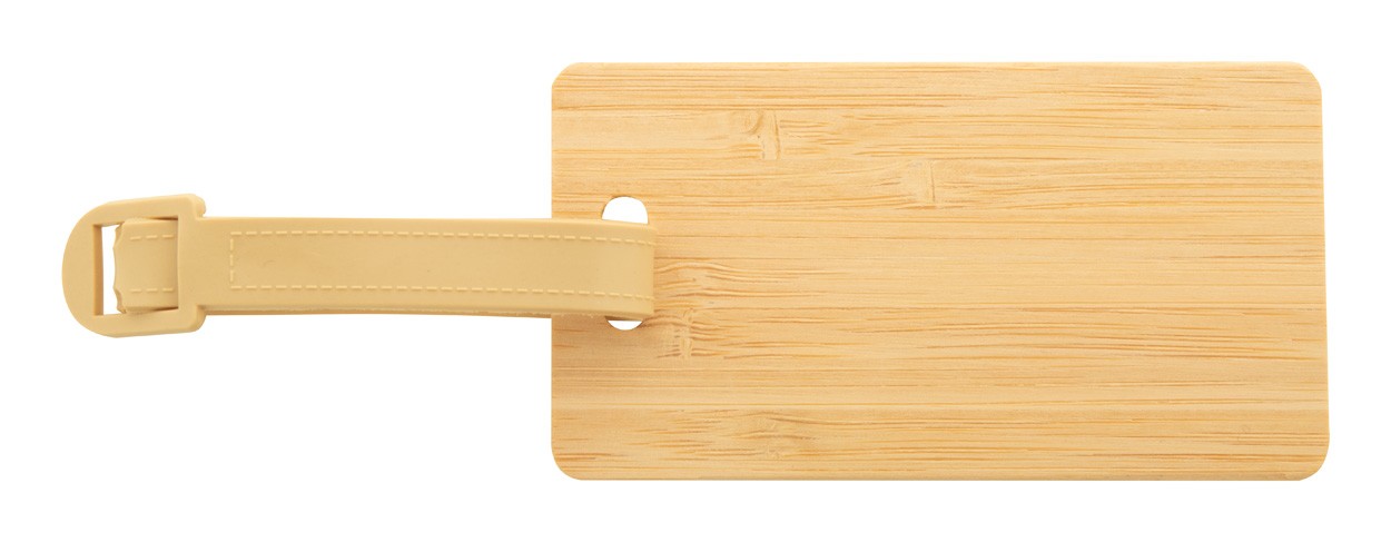 Etichetă de bagaj, din bambus, cu curea de plastic și cataramă.