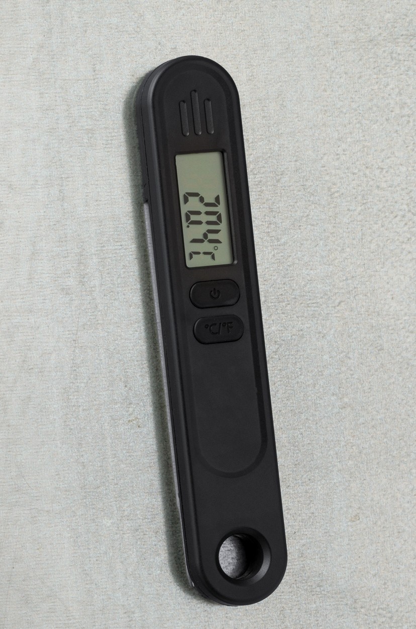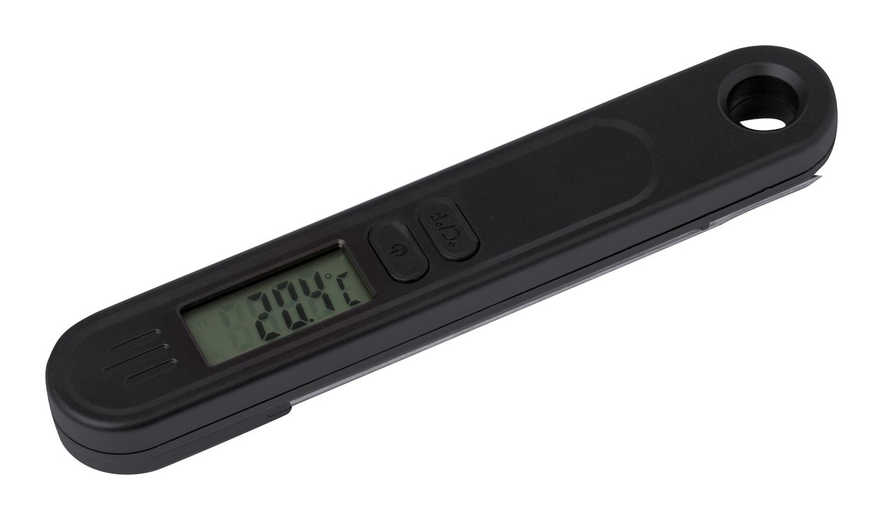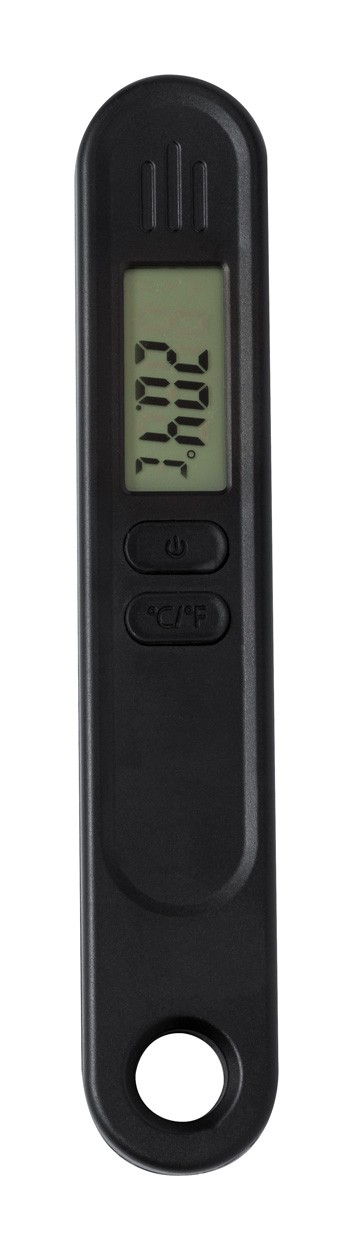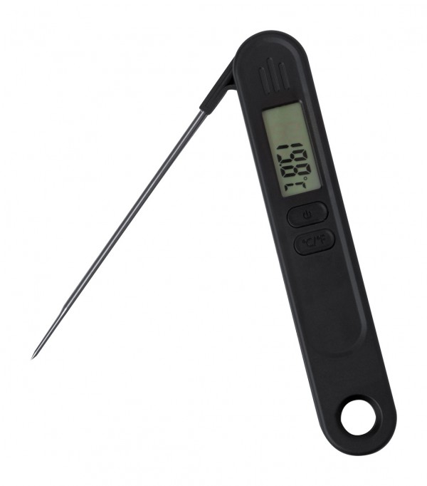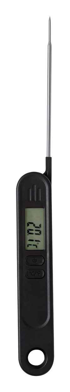 Digital thermometer with metal probe and LCD display. Operates with 1 AAA battery, without battery.