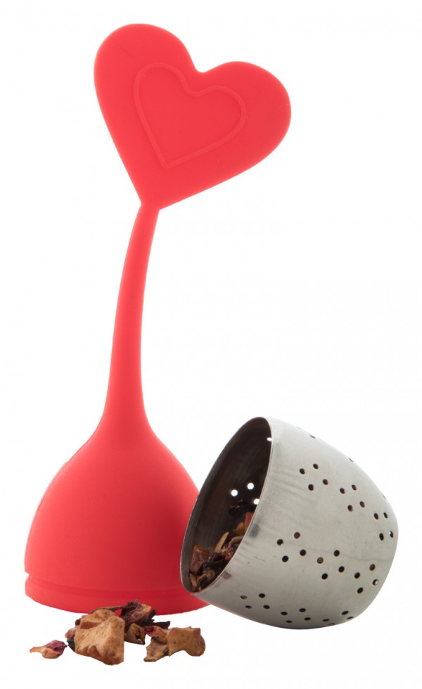 Infuzor ceai din silicon și oțel inoxidabil, capac în formă de inimă.