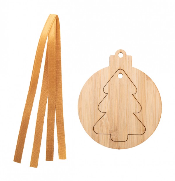 Ornament 2 in 1 pentru brad de Craciun din placaj de bambus, cu panglica aurie. Se livreaza cu panglica detasata.