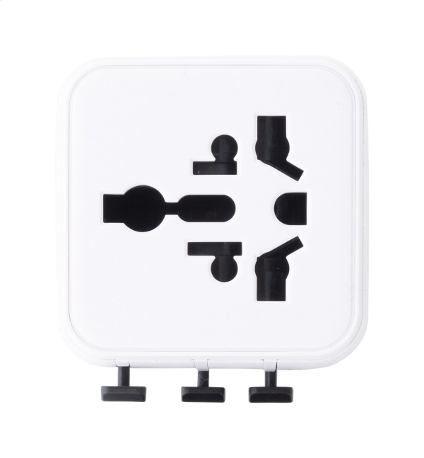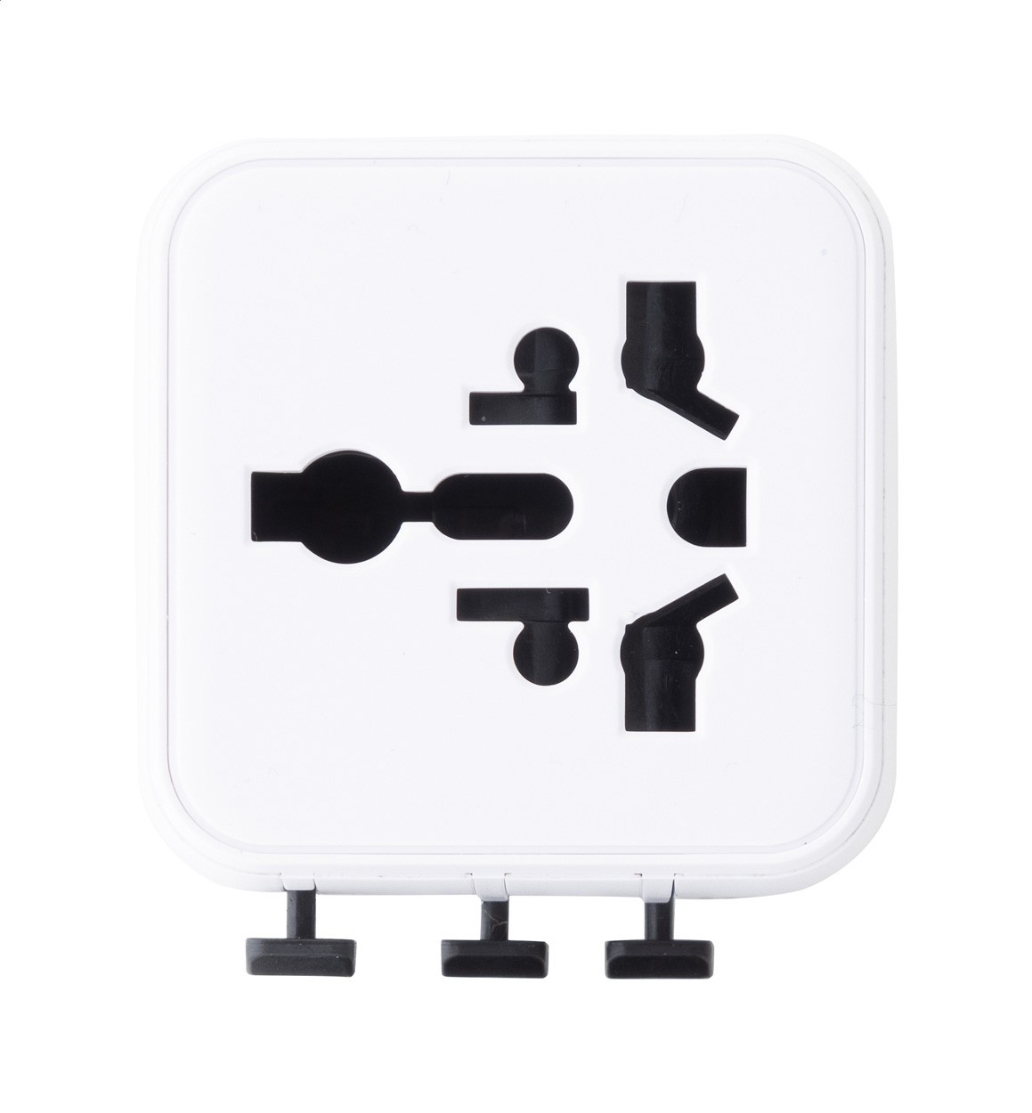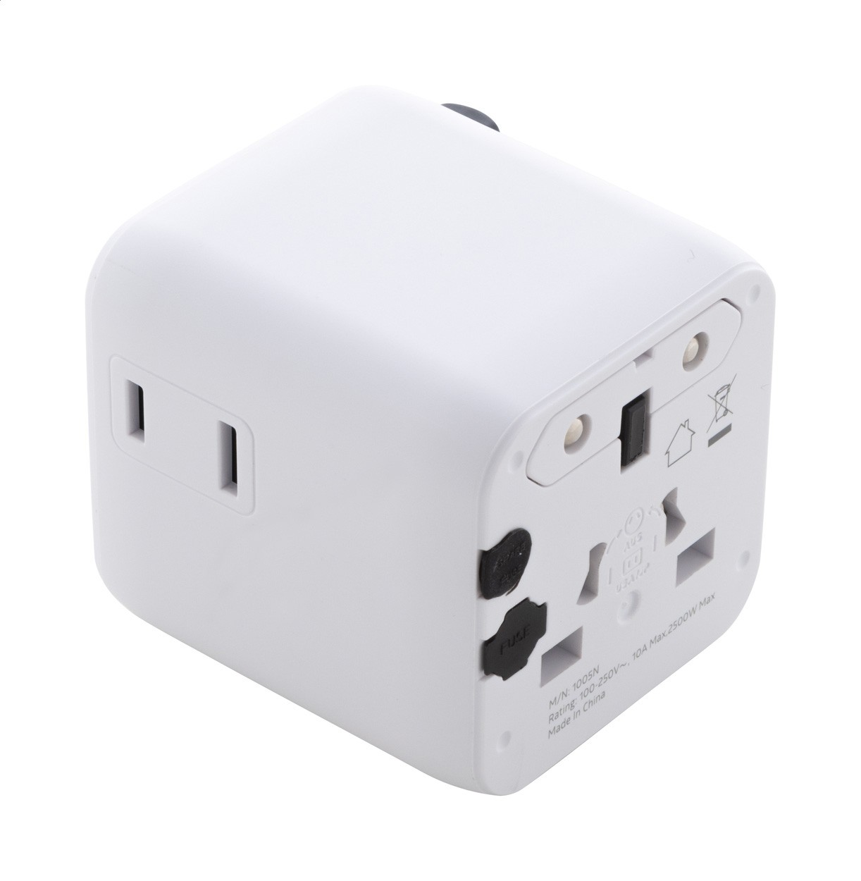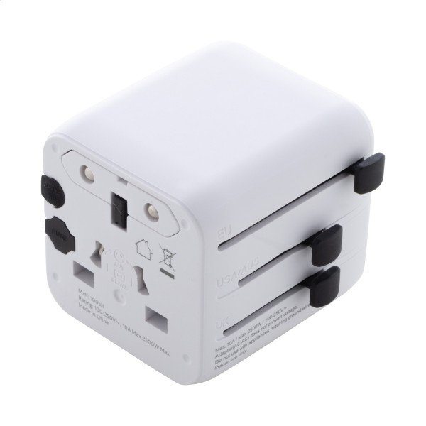 Adaptor de călătorie universal, ultra compact, din plastic PC reciclat, cu prize de perete încorporate pentru SUA, Europa, Marea Britanie și Australia.
