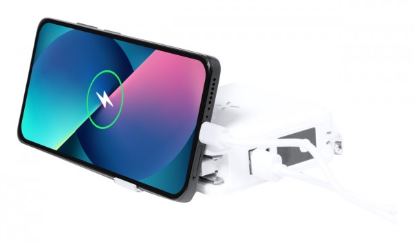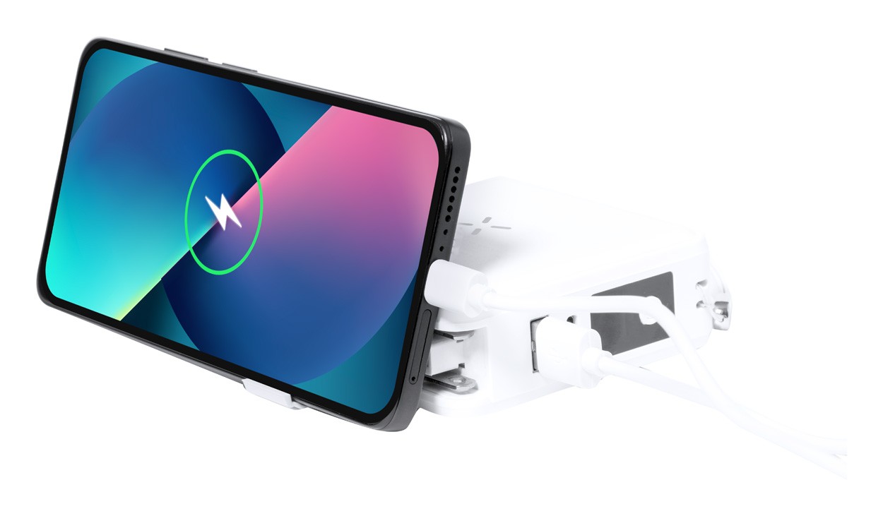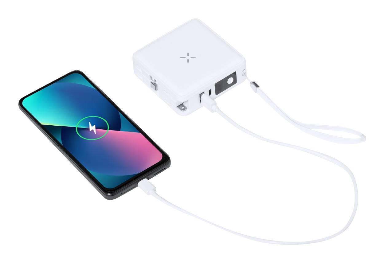 Powerbank multifuncțional / adaptor de călătorie, cu curea de transport și prize de perete schimbabile pentru SUA, Europa, Marea Britanie și Australia. Cu baterie de 10000 mAh, încărcător rapid fără fir încorporat (15W), 1 porturi USB și 1 USB-C pentru încărcător.
