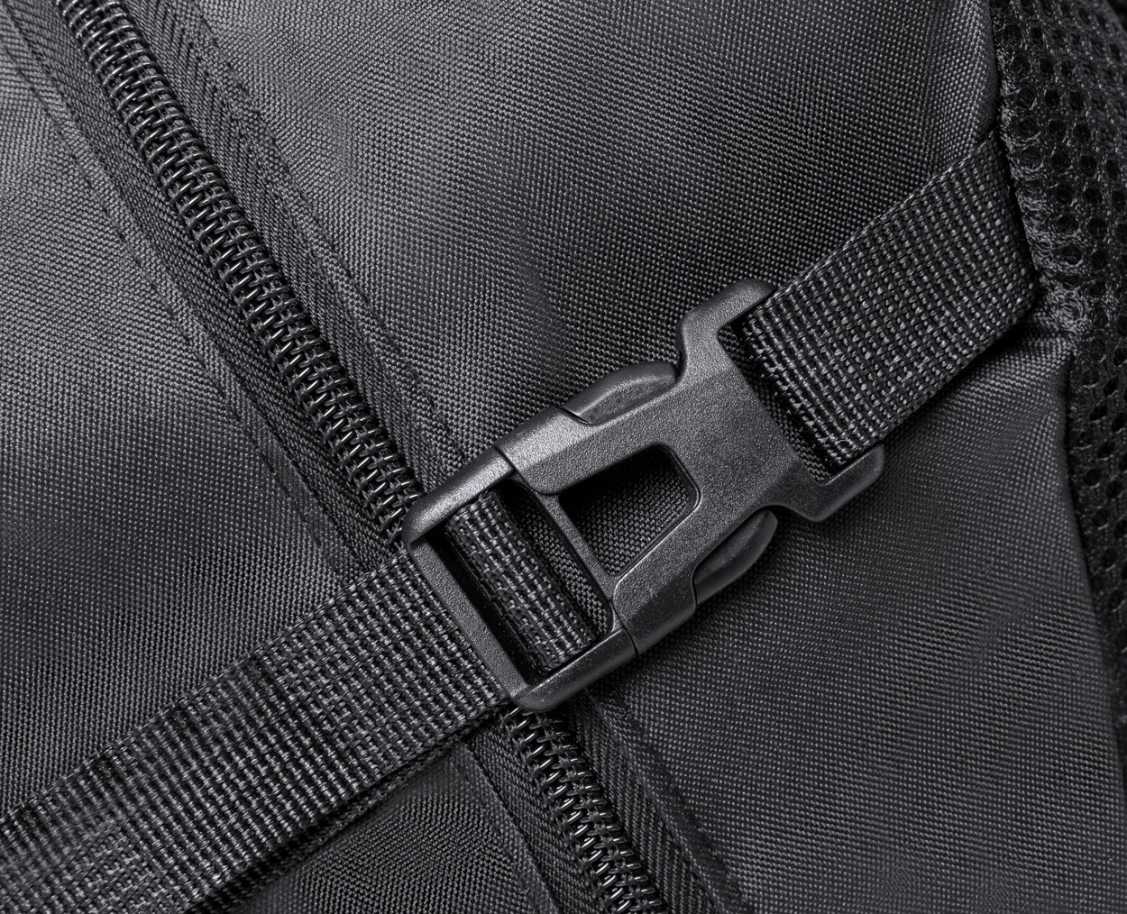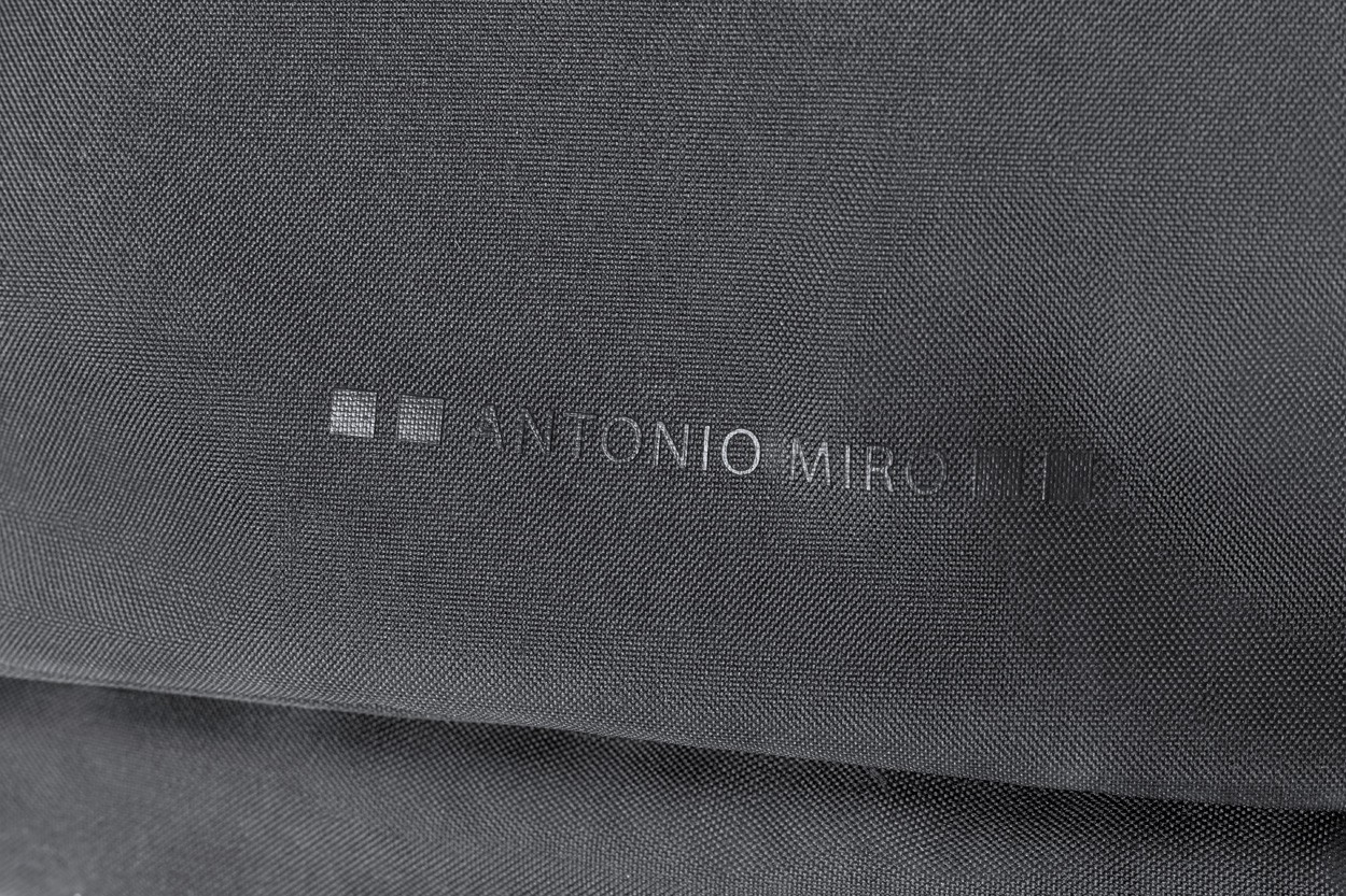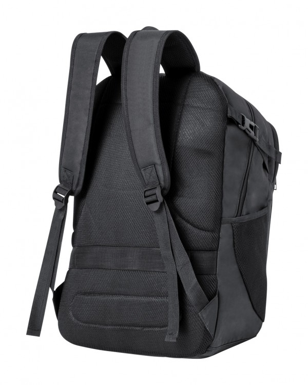 Rucsac cu compartimente principale și buzunare cu fermoar, compartimente pentru laptop (17") și tabletă (10"), curea pentru cărucior, spate și bretele căptușite. Poliester 300D. Produs marca Antonio Miro.