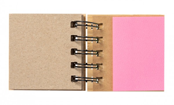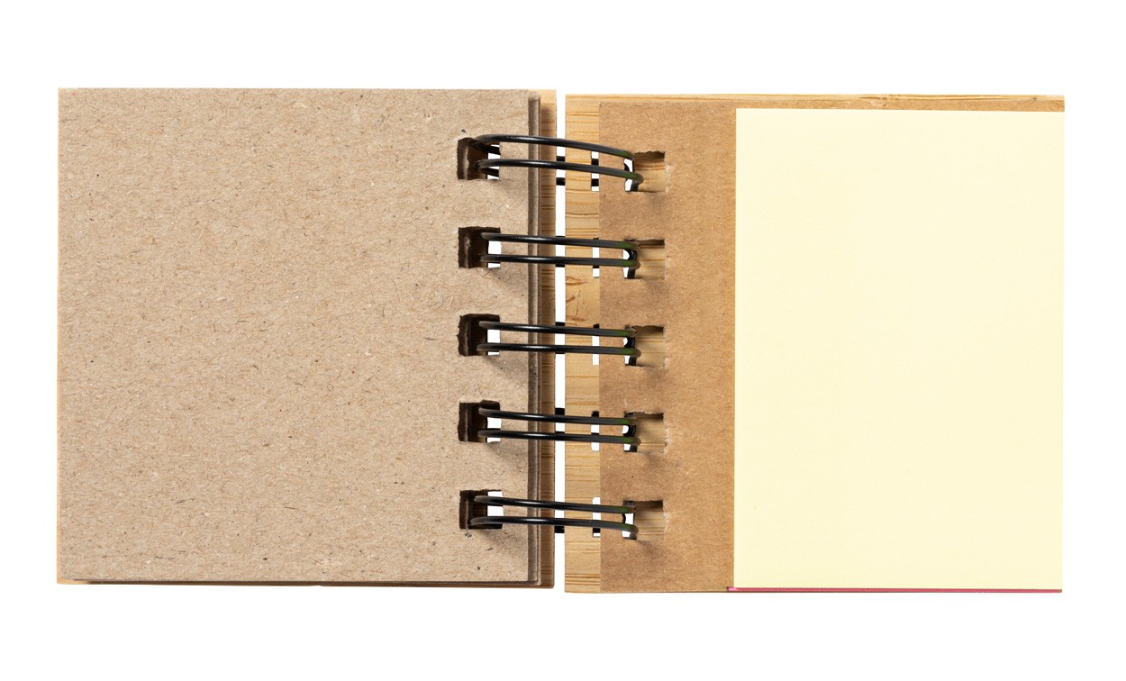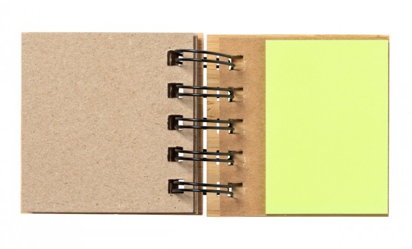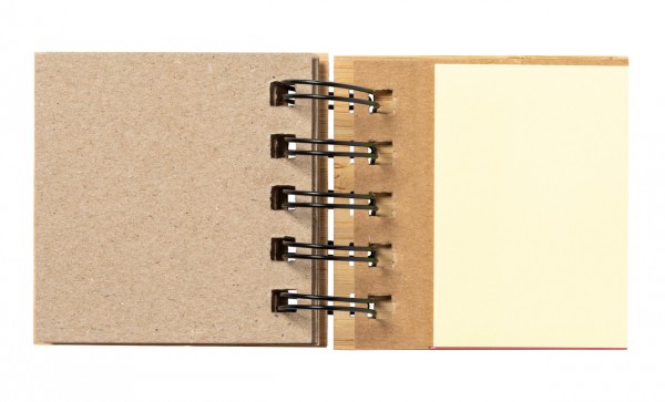 Blocnotes cu spirală si copertă din bambus, cu 75 de note mari (în 3 culori diferite) și 125 de note adezive mici (în 5 culori diferite).