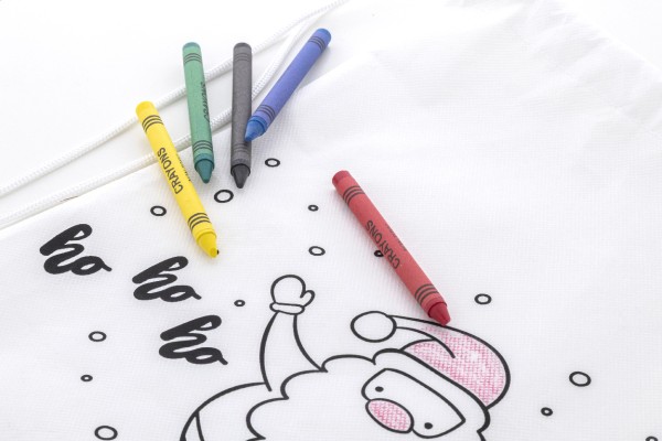 Săculeț de Crăciun cu șnur, de colorat, din material nețesut RPET, cu 5 creioane colorate.