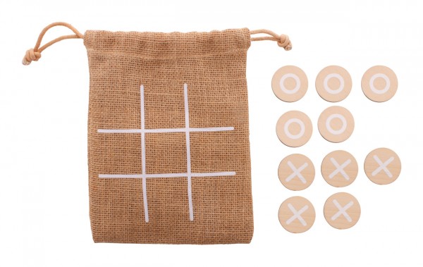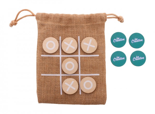 Joc X și 0 realizat la comandă din placaj de mesteacăn, cu 10 jetoane și husă de transport de iută. Prețul include imprimare color identică pe spatele tuturor jetoanelor. MOQ: 100 buc.
