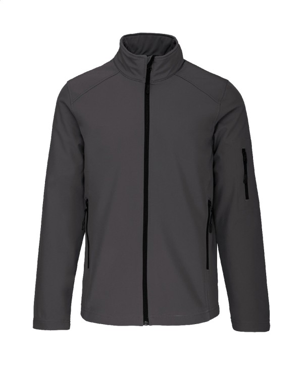 Jachetă softshell cu fermoar, triplu strat, respirabilă, rezistentă la vânt și impermeabilă, cu mâneci și buzunare laterale cu fermoar. Cu strat intermediar respirabil și strat interior din micro-polar fleece. 95% poliester și 5% elastan, 300 g/m². Produs marca Kariban.