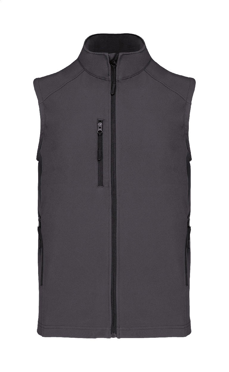 Vestă softshell cu fermoar, triplu strat, respirabilă, rezistentă la vânt și impermeabilă, cu buzunare laterale și cu fermoar la piept. Cu strat intermediar respirabil și strat interior din micro-polar fleece. 95% poliester și 5% elastan, 300 g/m². Produs marca Kariban.