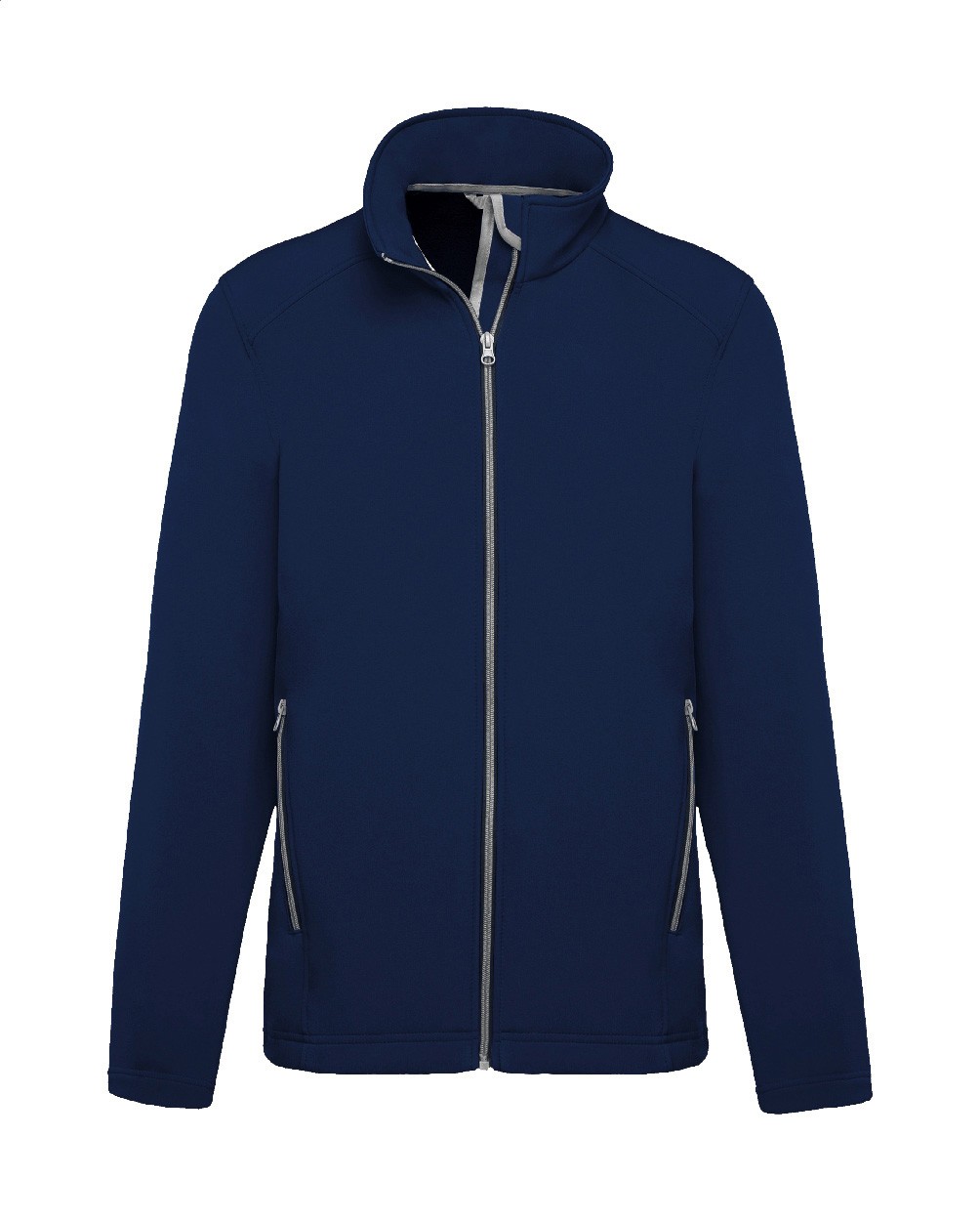 Jachetă softshell cu dublu strat, cu fermoar și buzunare laterale cu fermoar. Fermoare contrastante. Material hidrofug. Exterior: 95% poliester și 5% elastan. Interior: micro-polar fleece 100% poliester. 300 g/m². Produs marca Kariban.
