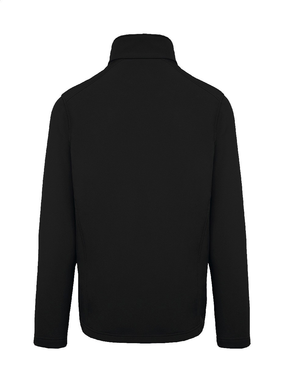 Jachetă softshell cu dublu strat, cu fermoar și buzunare laterale cu fermoar. Fermoare contrastante. Material hidrofug. Exterior: 95% poliester și 5% elastan. Interior: micro-polar fleece 100% poliester. 300 g/m². Produs marca Kariban.