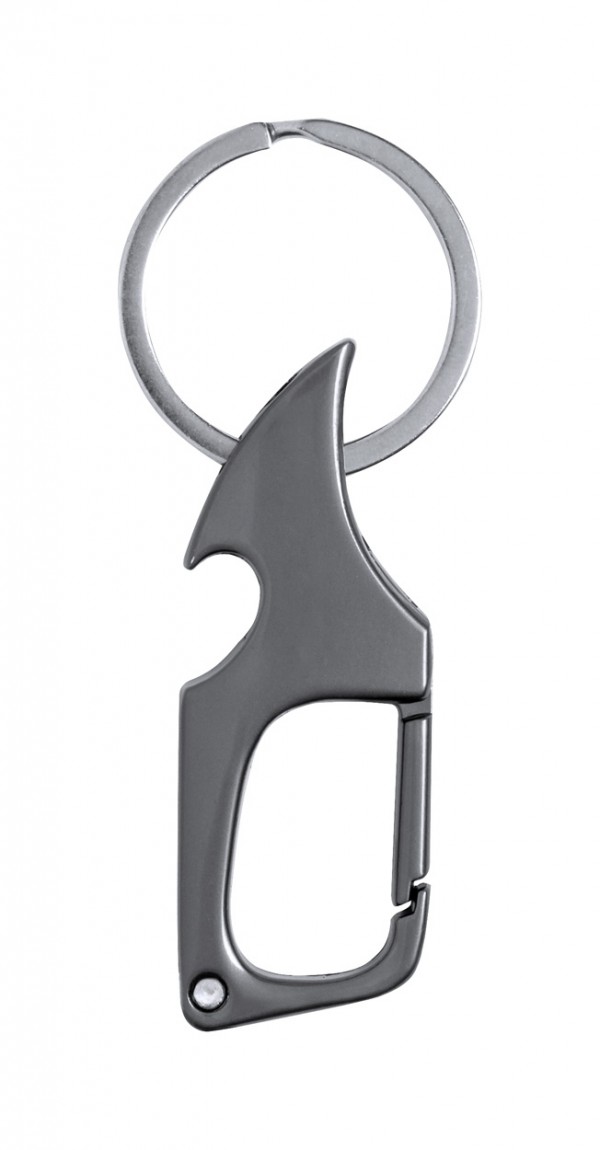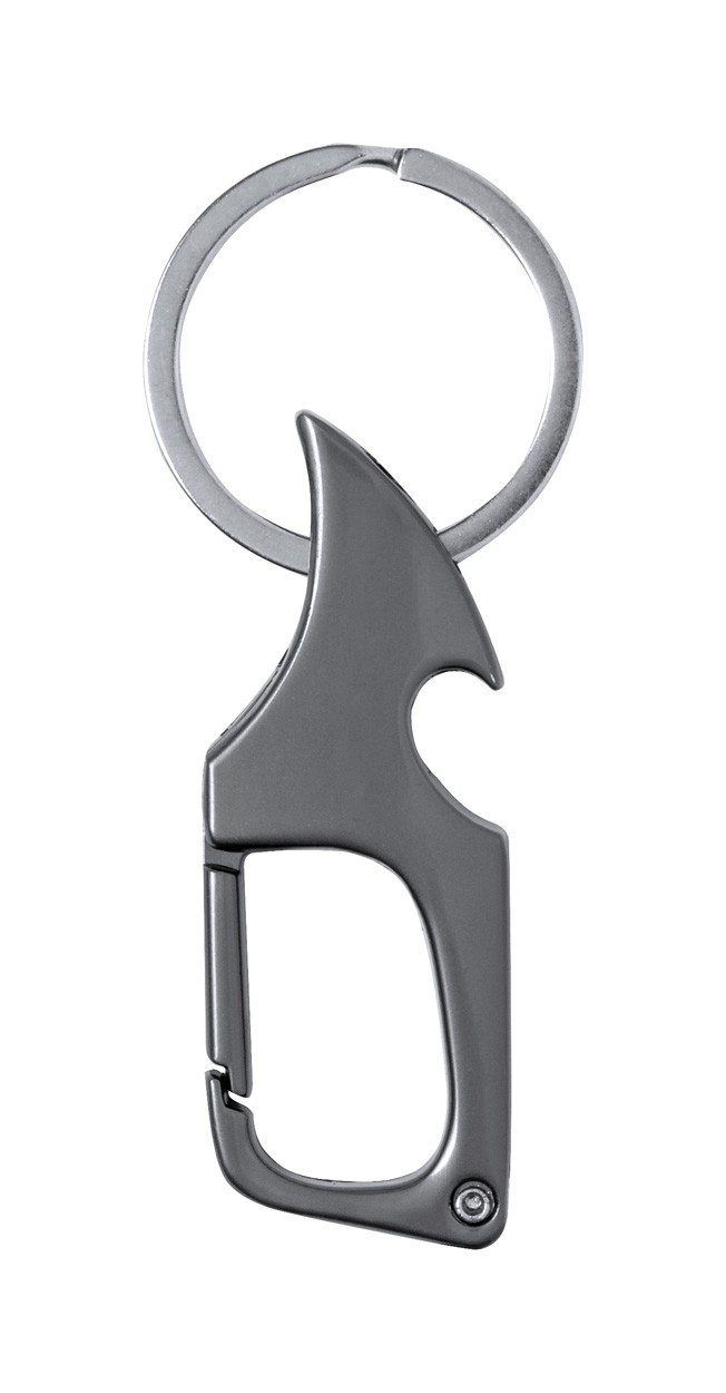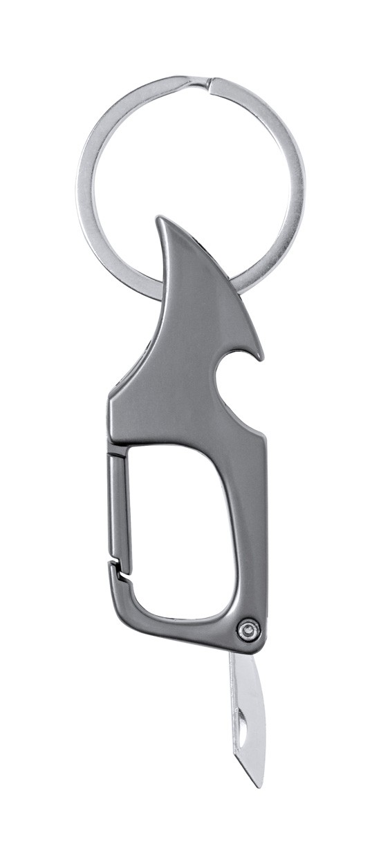 Metal keyring with bottle opener, carabiner and stainless steel knife.