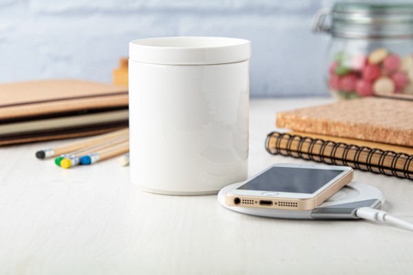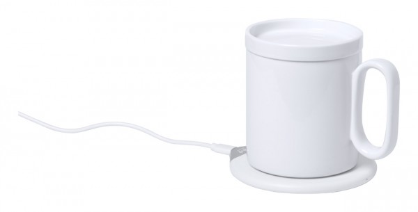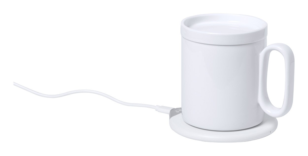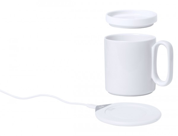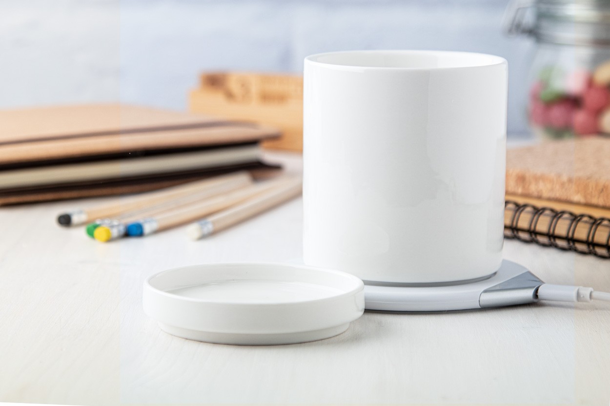 încălzitor cană cu încărcător rapid wireless încorporat. Prețul include și o cană ceramică cu capac (350 ml) și cablul de încărcare USB.