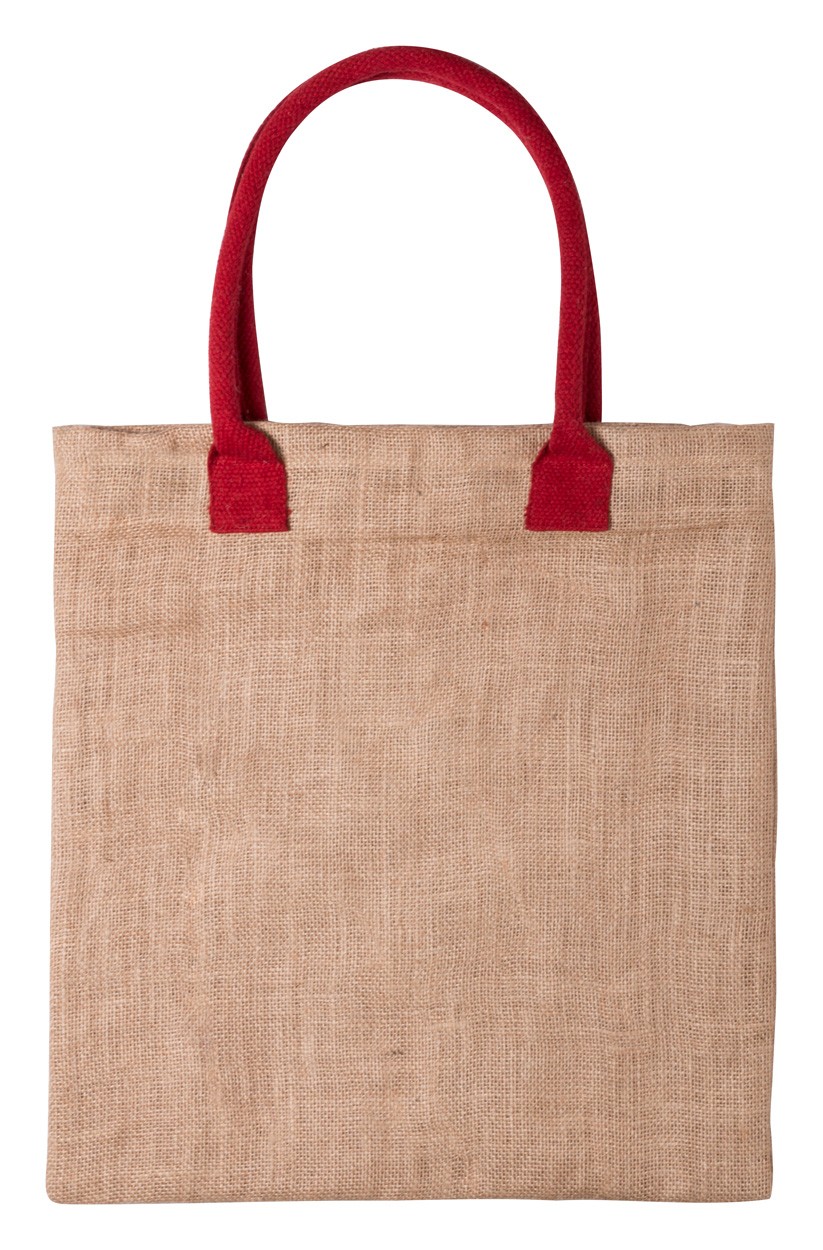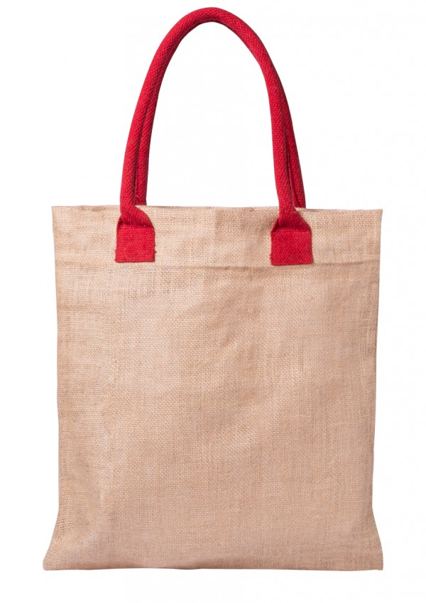 Sacoșă pentru cumpărături din iută, cu mânere colorate.