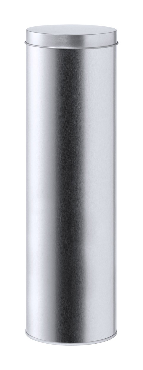 Cutie cadou cilindrică, din metal, cu finisaj argintiu, pentru sticle.
