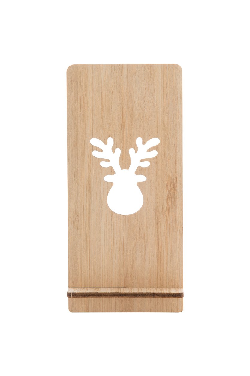 Suport telefon mobil, de birou, din placaj de bambus cu motiv de Crăciun traforat. Livrat ambalat plat.