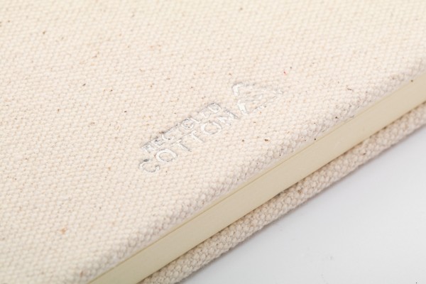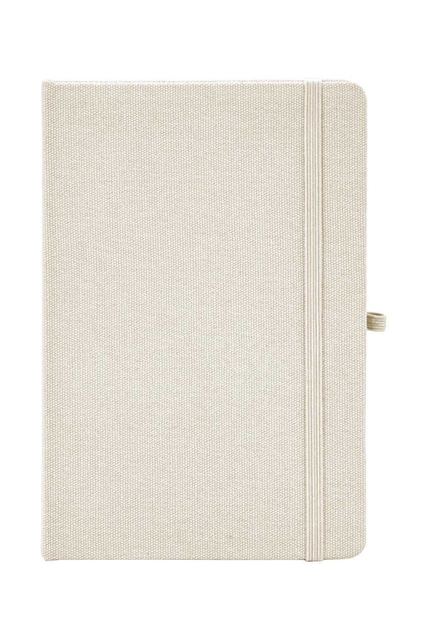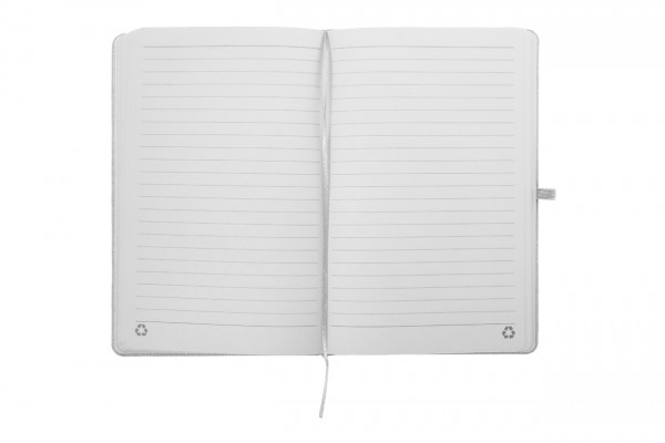 Caiet cu coperta din bumbac reciclat, cu 80 de foi dictando, din hârtie reciclată. Cu semn de carte de culoare, bandă de cauciuc și suport pentru pix. Dimensiune A5.