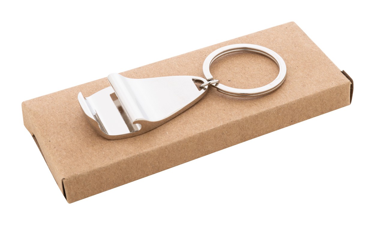 Breloc metalic cu deschizător de sticle. În cutie de hârtie kraft.