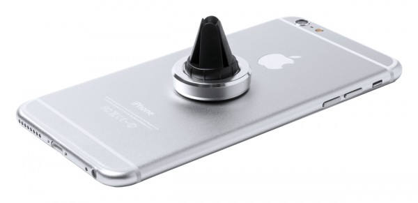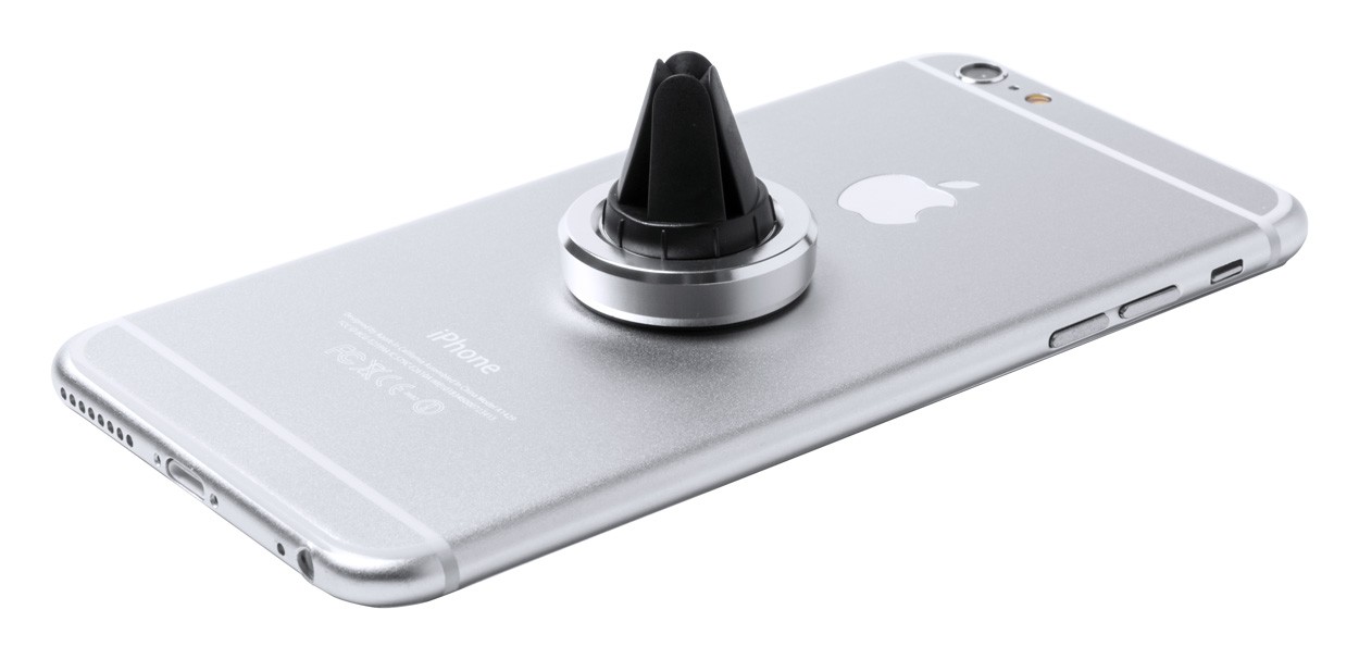 Suport magnetic pentru telefon mobil, din aluminiu, cu montare pe aerisire. Cu placă metalică autoadezivă. În cutie de cadou.