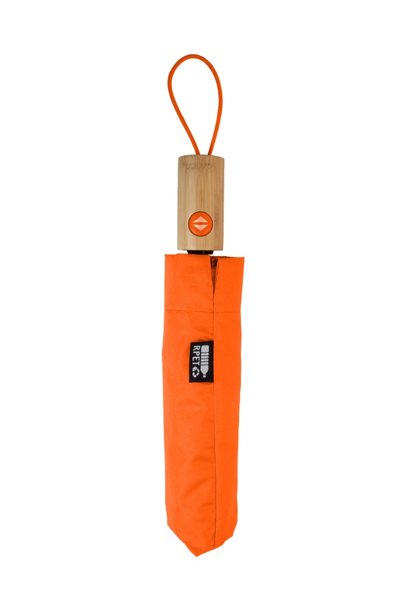 Umbrelă pliabilă, complet automată (deschidere/închidere), rezistentă la vânt, cu 8 panouri, în husă de culoare asortată. Cu cadru metalic, nervuri din fibră de sticlă și mâner din bambus. Pongee 190T RPET. Cu etichetă distinctivă RPET.