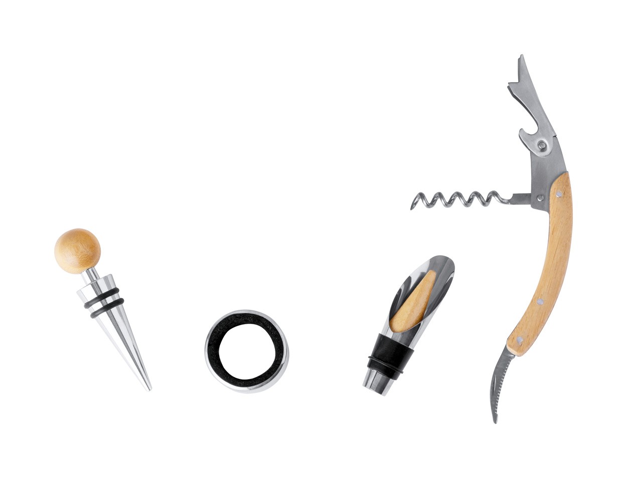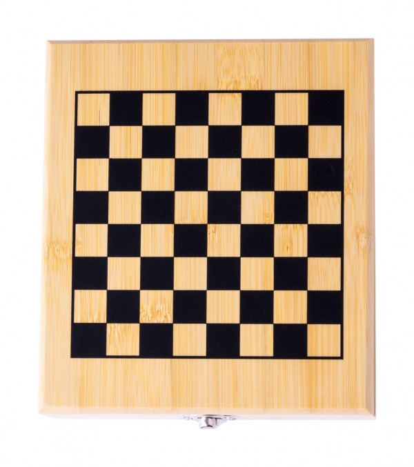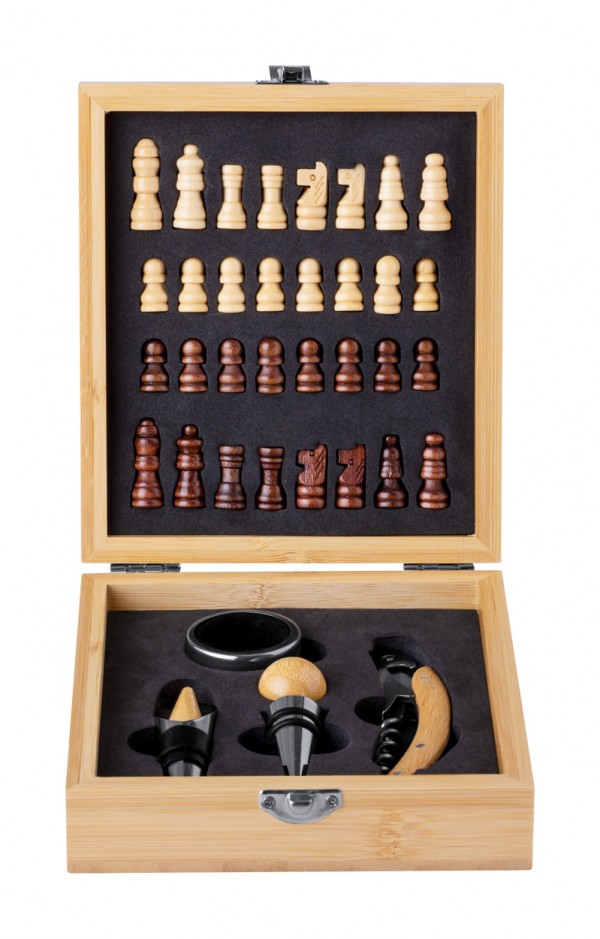 Set de vin, din oțel inoxidabil, cu incrustație de bambus, 4 buc, în cutie de bambus cu tablă de șah și 32 de piese de șah. Include tirbușon, dop de picătură, duză și dop.