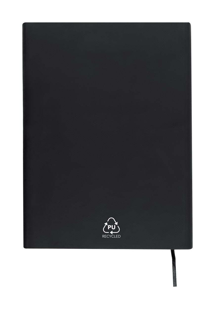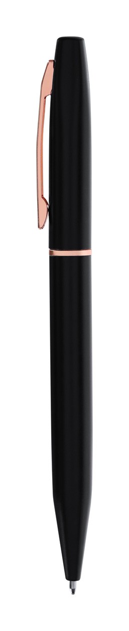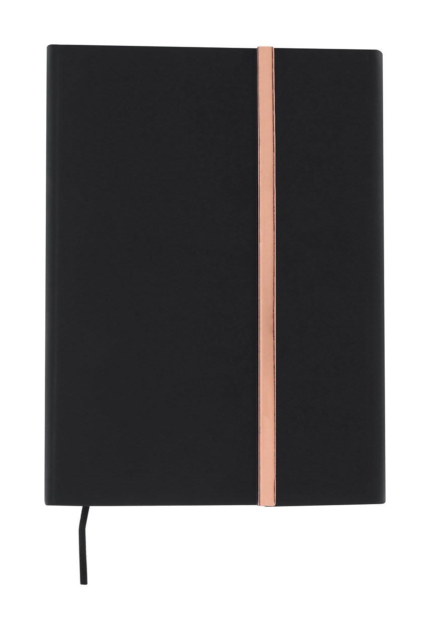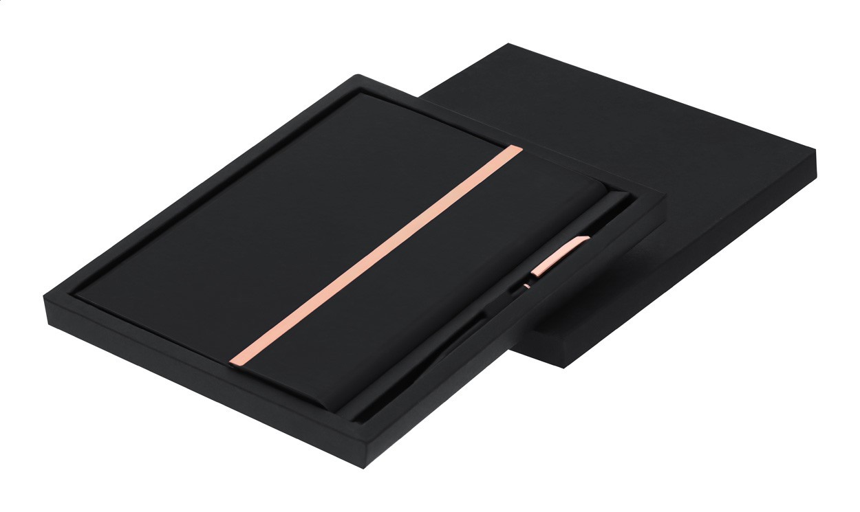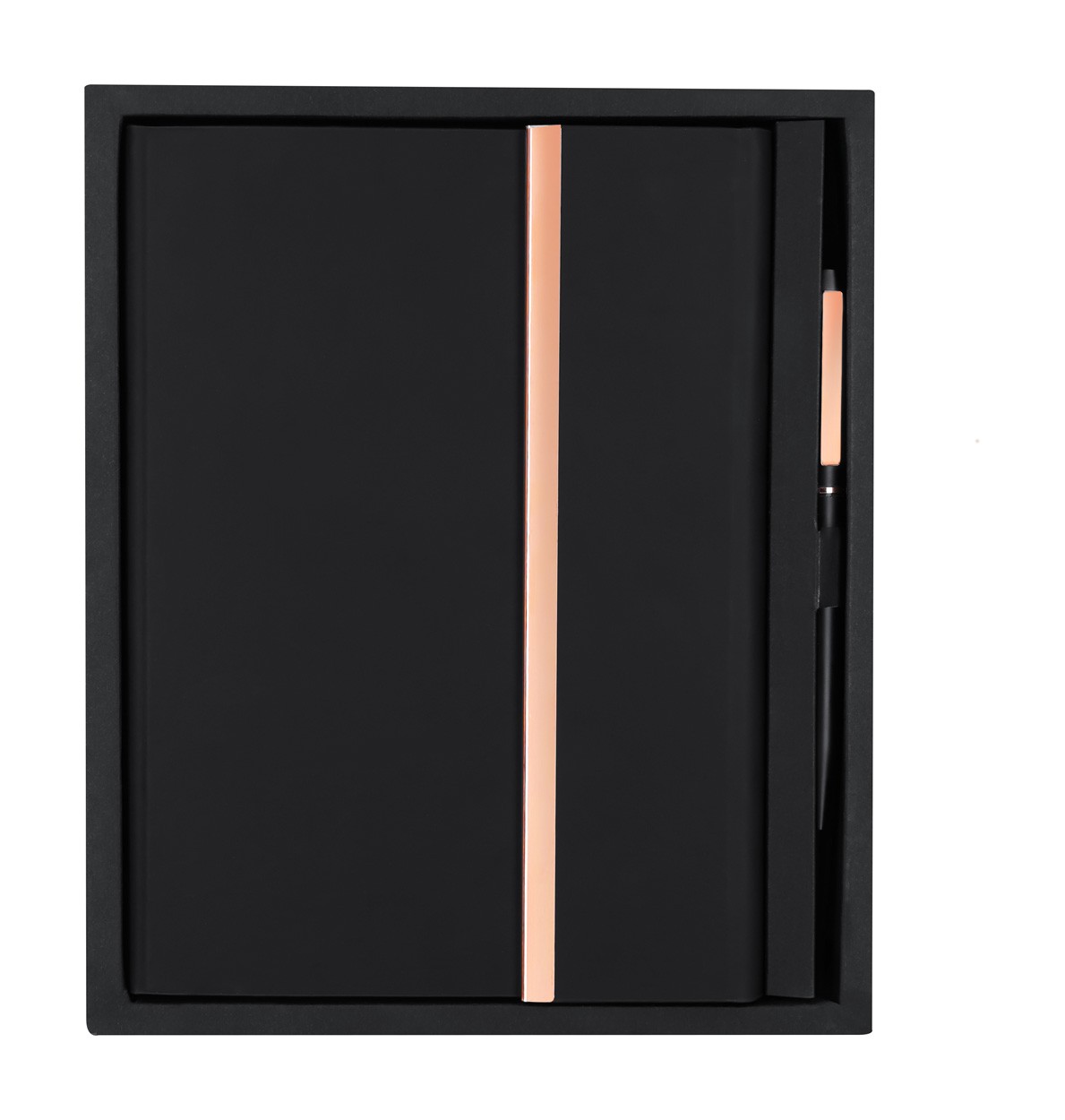 Set agendă si pix cu detalii roz auriu. Include agendă cu copertă din piele PU reciclată cu 80 de foi dictando și pix din aluminiu reciclat cu mină albastră. În cutie cadou neagră.