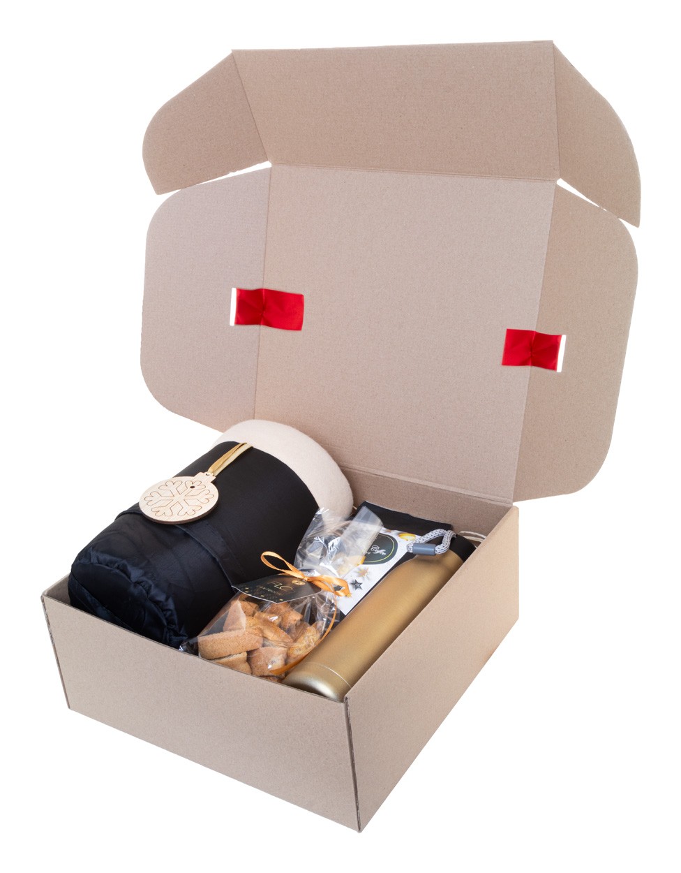 Set cadou de călătorie, în cutie cadou din carton kraft cu umplutură de lână de lemn și panglică roșie. Include: pătură polară RPET „Kayla”; termos "Makalu"; Cafea "Luis" Costa Rica (40 g); cantuccini artizanali „Floq” (100g); Ornament pentru brad "Jerpstad".