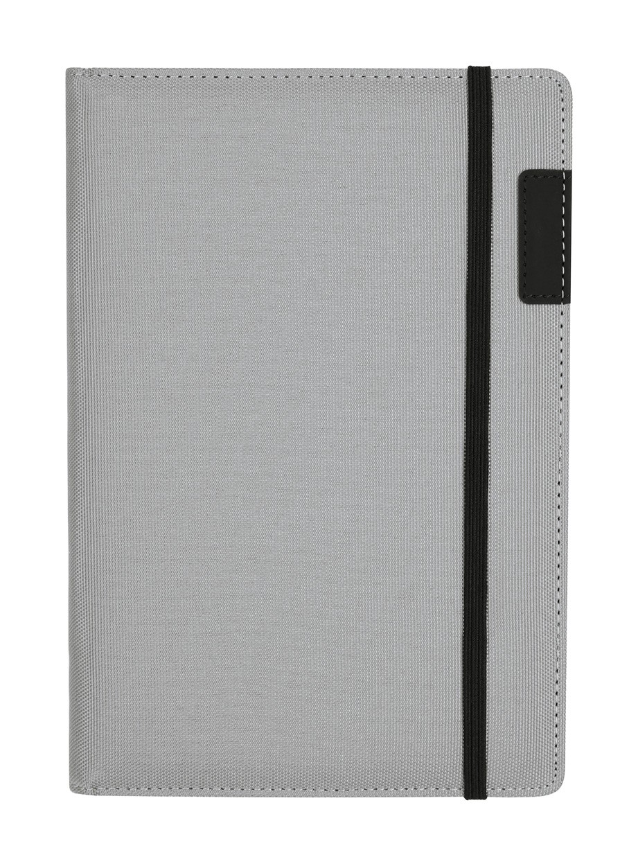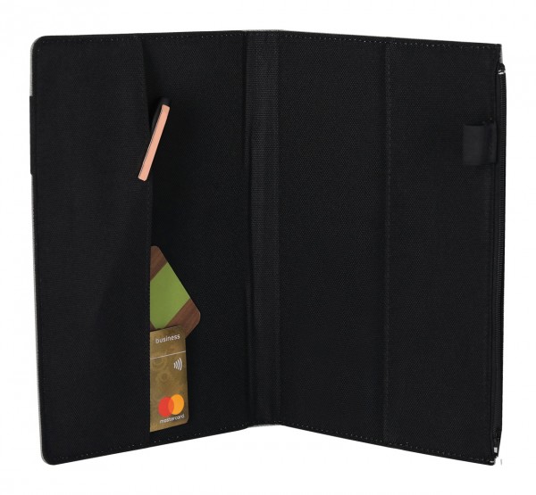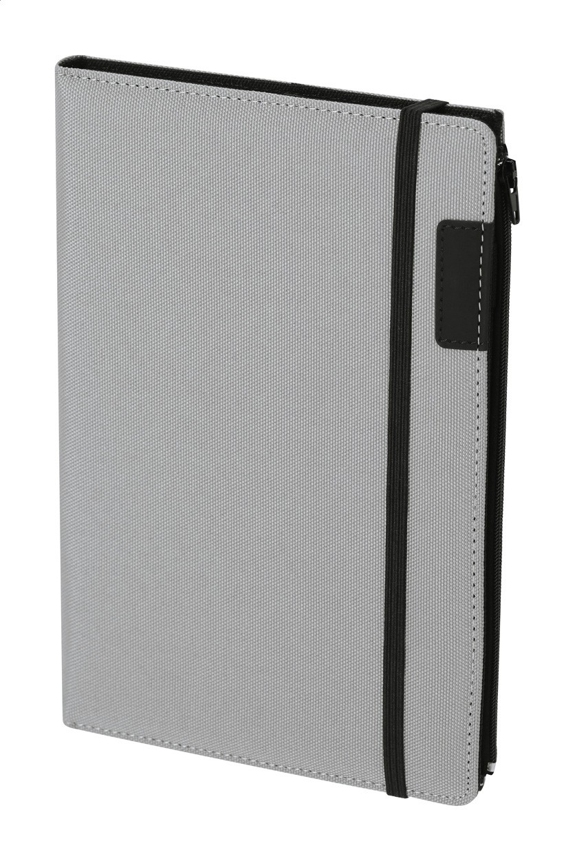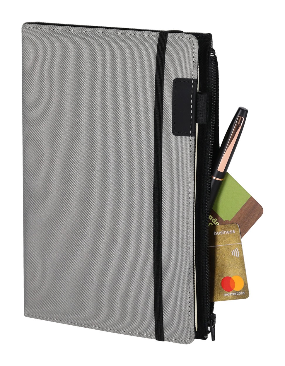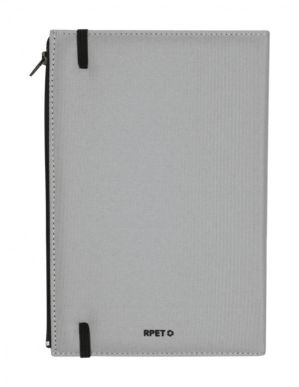 Agendă cu copertă din poliester 600D RPET, cu buzunar cu fermoar, bandă de cauciuc și 100 de coli dictando. Dimensiune A5.