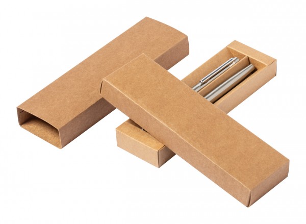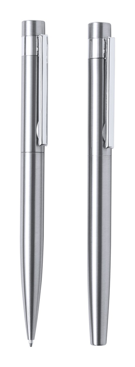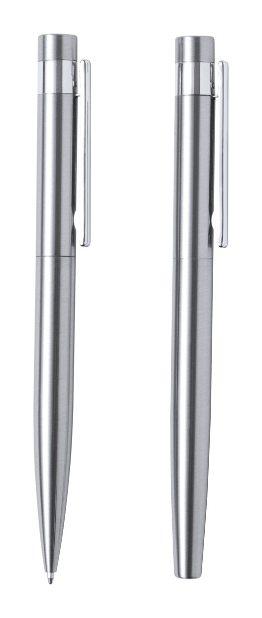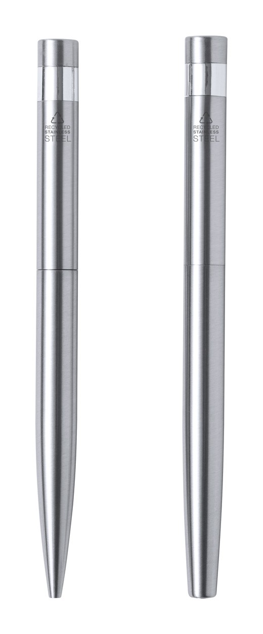 Set pix din oțel inoxidabil reciclat și pix cu role. Cu mină albastră. În cutie de hârtie kraft.