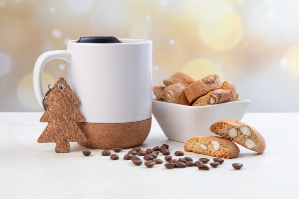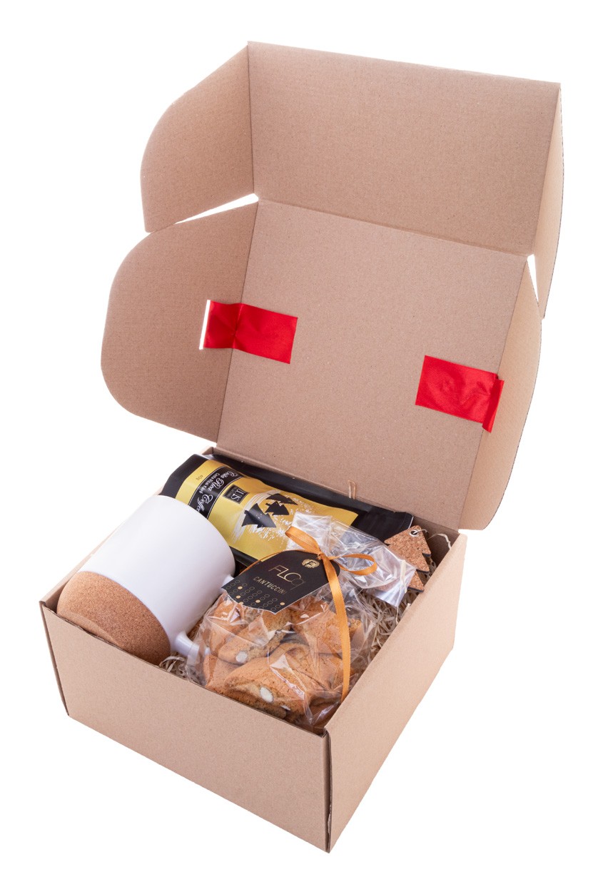 Set cadou cafea, în cutie cadou din carton kraft cu umplutură de lână de lemn și panglică roșie. Include: cană „Komagu”; Cafea "Luis" Costa Rica (40 g); cantuccini artizanali „Floq” (100g); Breloc de Crăciun „Korkki”.