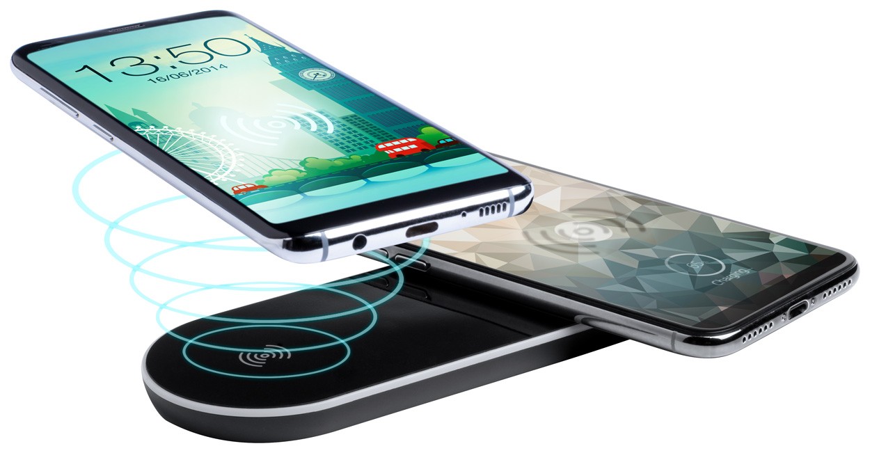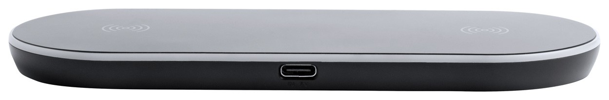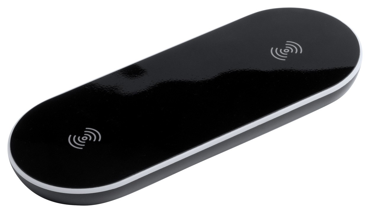 Încărcător dual wireless cu carcasa din plastic, cu lumină LED pentru gravură iluminată. Putere maximă 1000 mA.