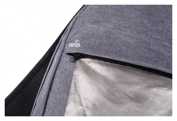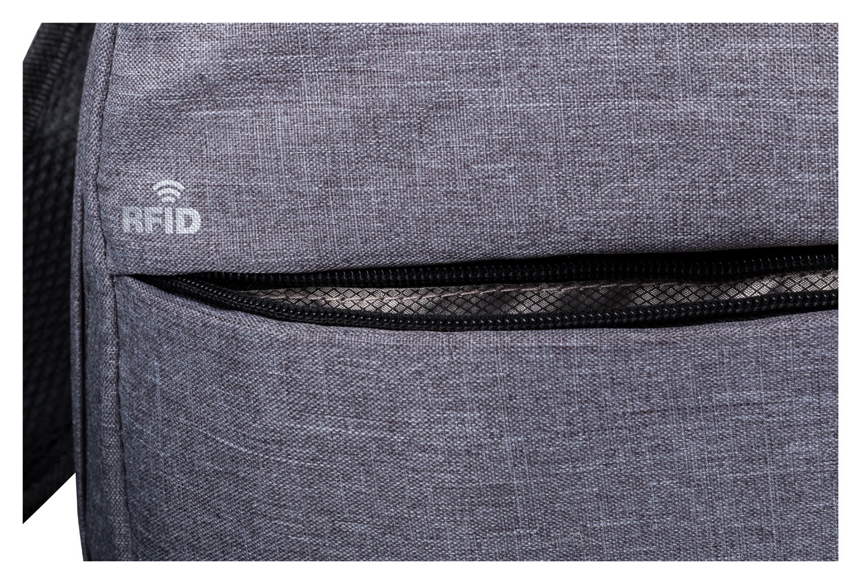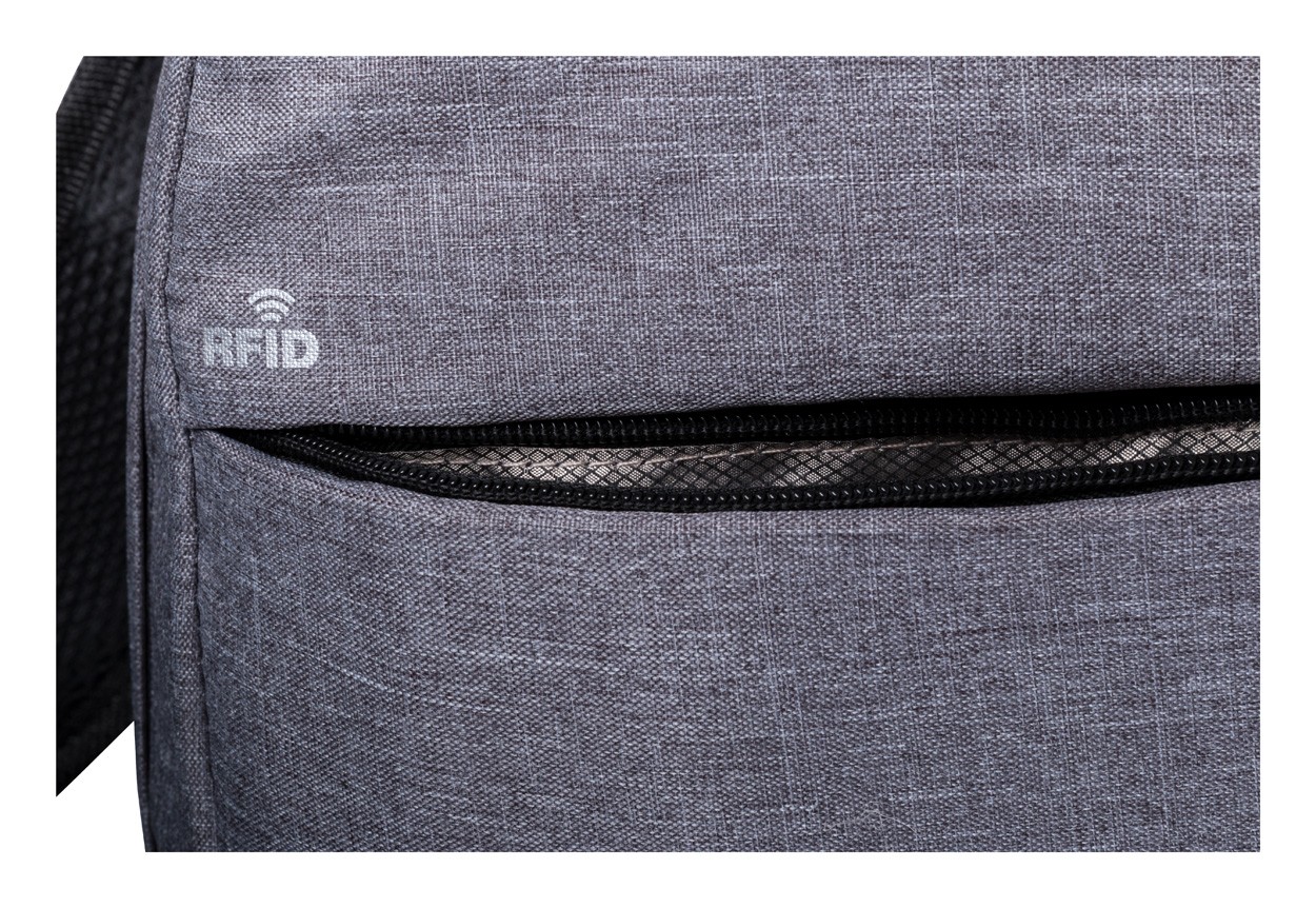 Rucsac cu protecție RFID, mai multe compartimente cu fermoar, compartiment pentru laptop (15 "), pate și bretele căptușite, conexiune USB încorporată pentru power bank. Poliester 300D.