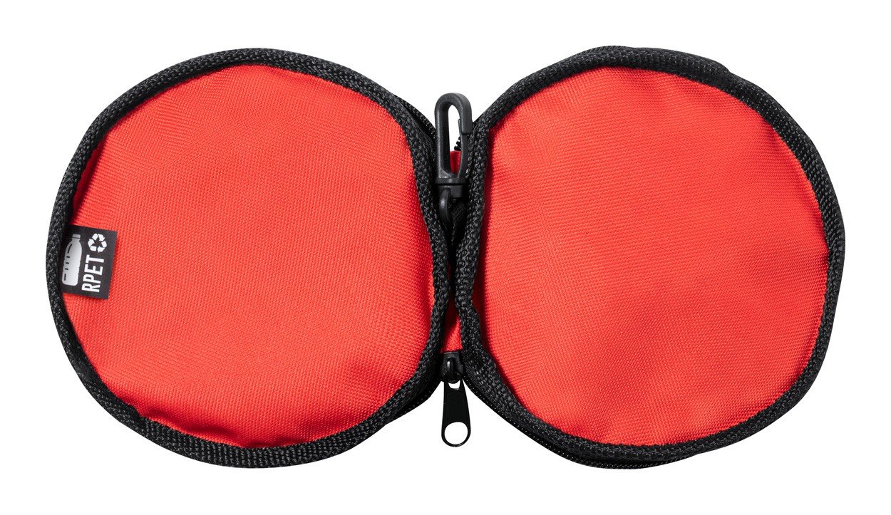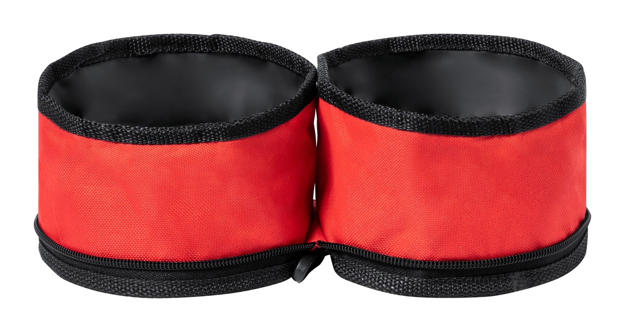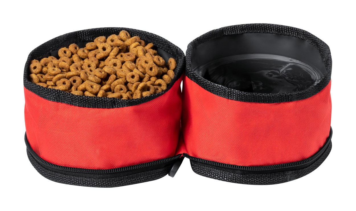 Bol pentru câini, pliabil, din poliester 600D RPET, cu suprafață interioară impermeabilă, 2 compartimente cu fermoar și carabină. Cu etichetă distinctivă RPET.