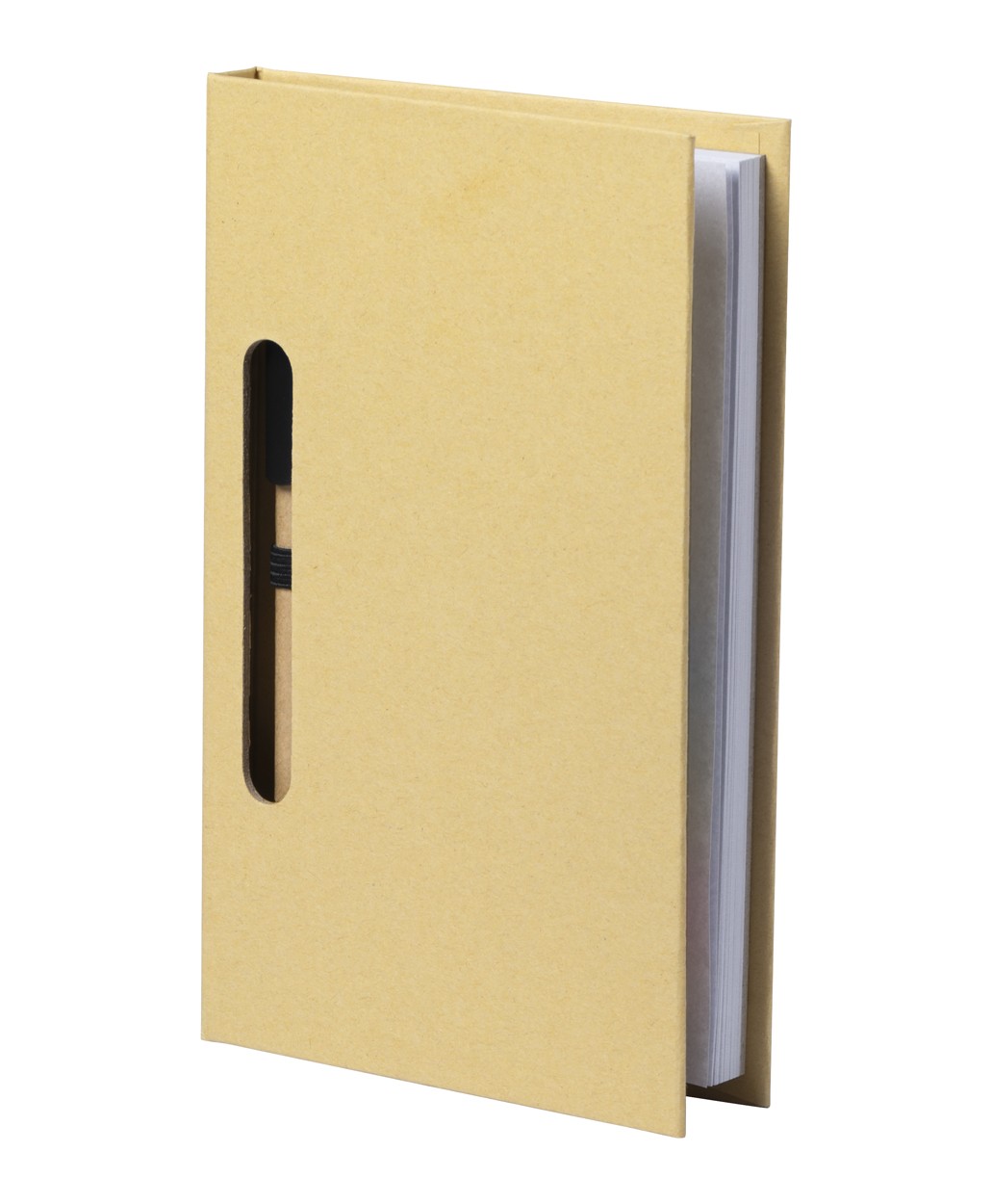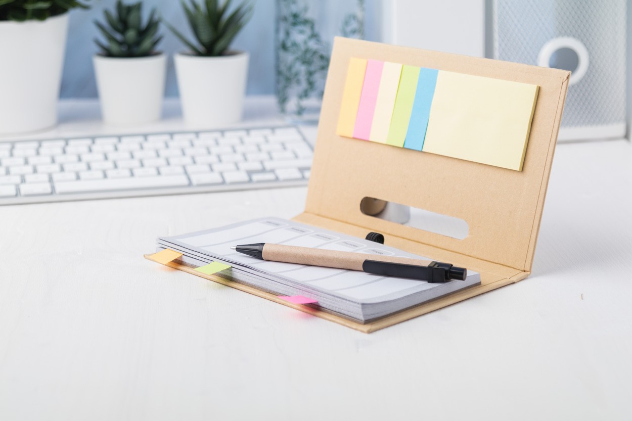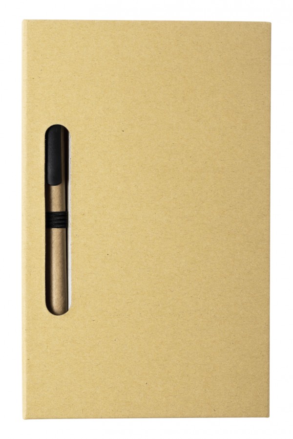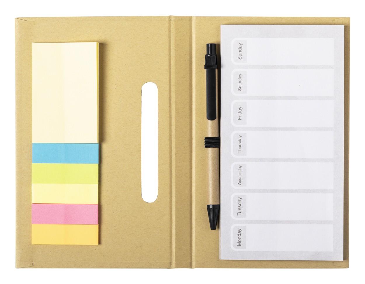 Agendă săptămănală cu copertă din carton reciclat, cu 25 de notițe adezive medii și 125 de notițe adezive mici. Pix din hârtie reciclată cu mină albastră.