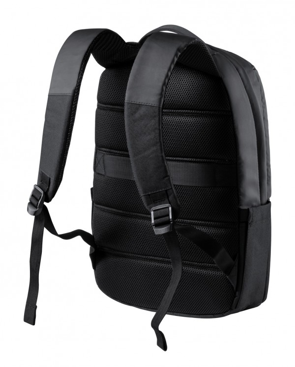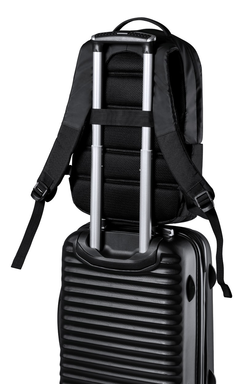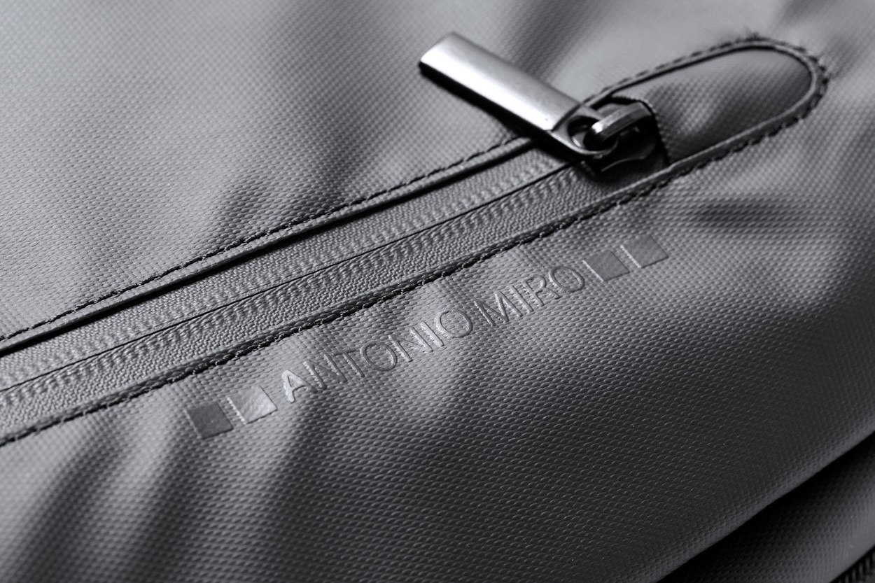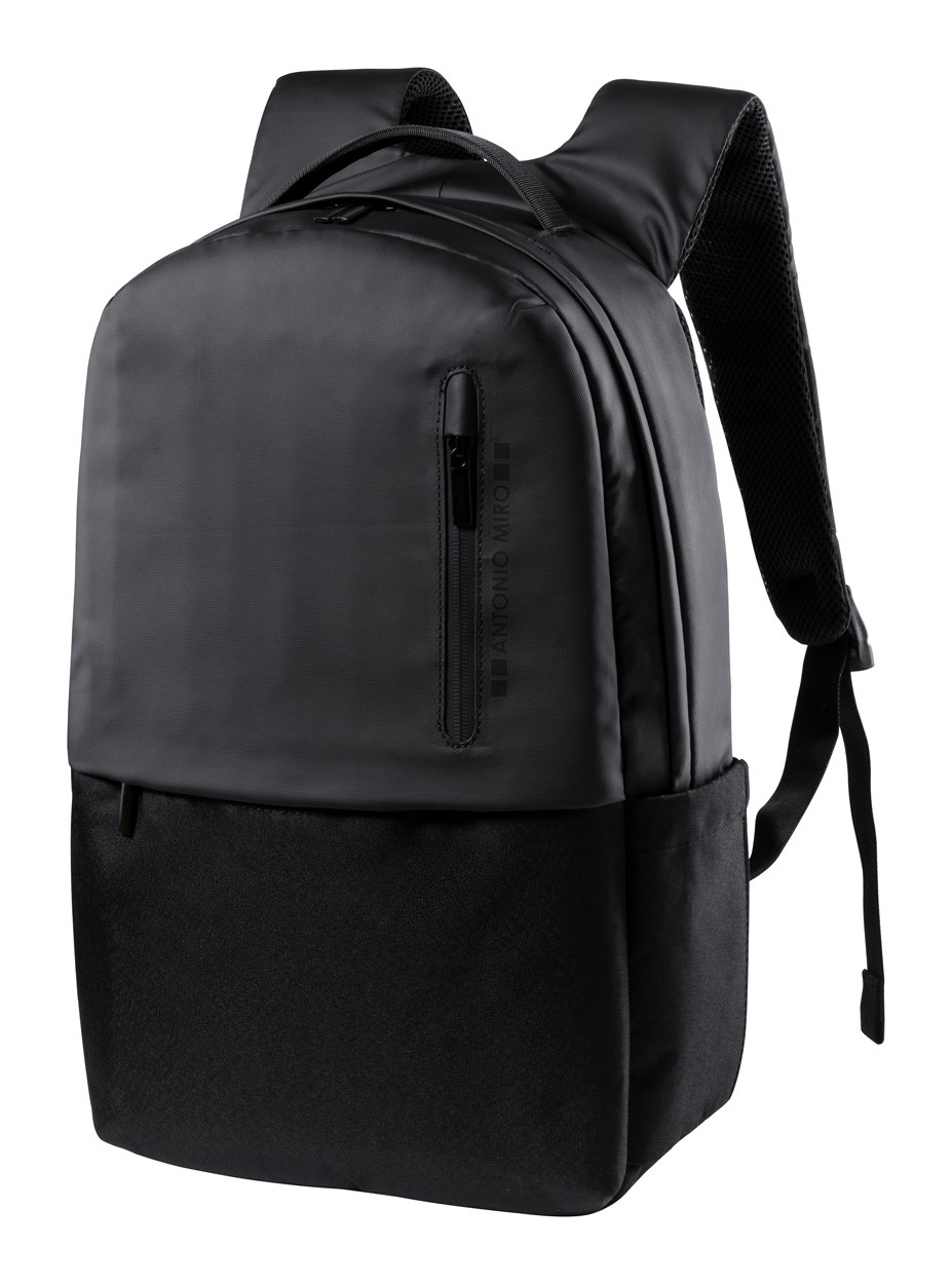Rucsac de calitate premium, cu compartiment principal cu fermoar, compartiment pentru laptop (15") și tabletă (10"), buzunare frontale, curea pentru cărucior, spate și bretele căptușite. Poliester 600D. Produs marca Antonio Miro.