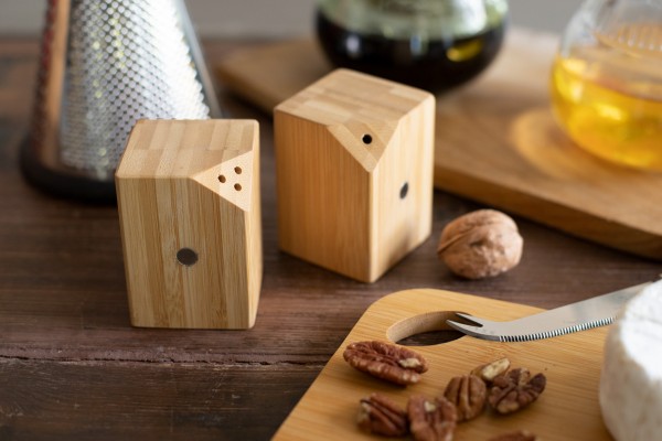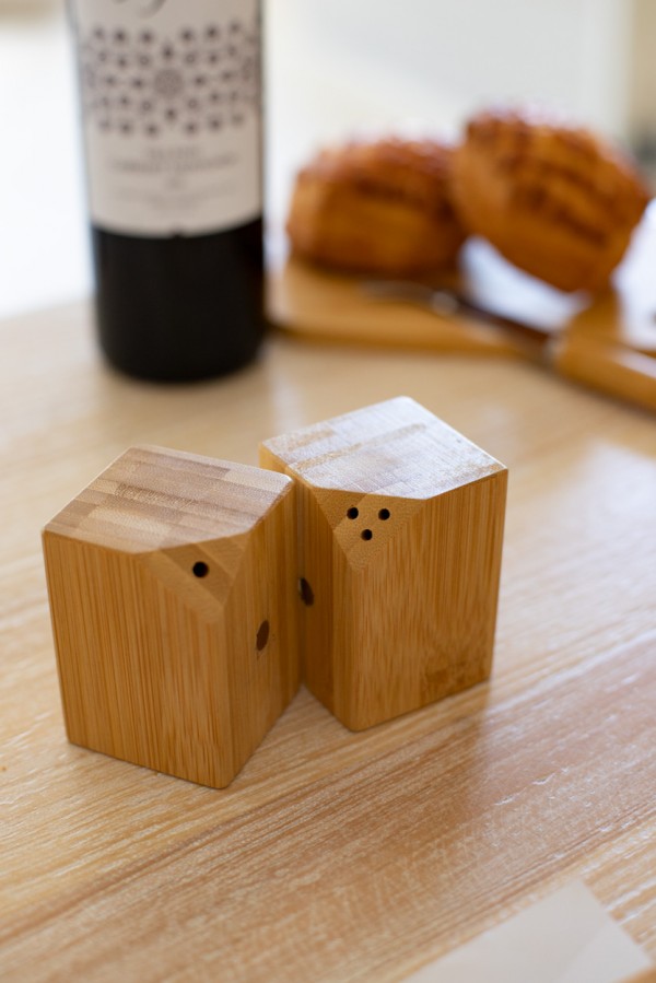 Set 2 bucăți de solniță de sare și piper, din bambus. Setul se etanșează în mod convenabil în centru datorită magneților poziționați pe partea laterală.