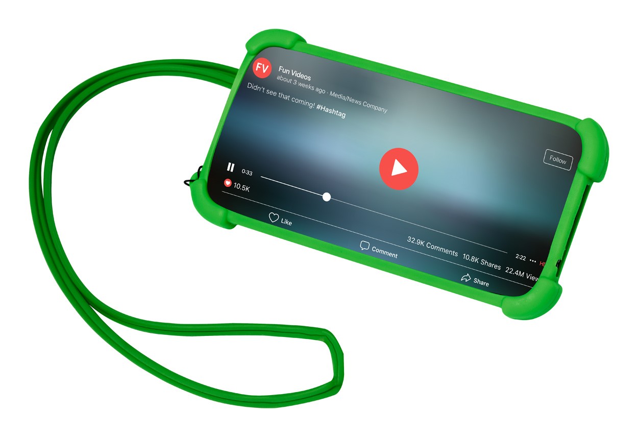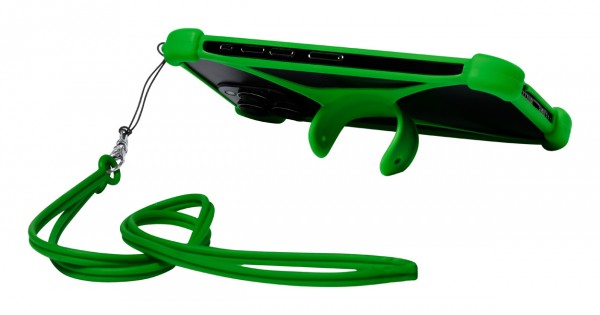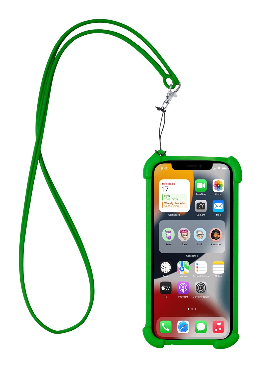 Lanyard din silicon, cu suport telefon mobil și carabină metalică.